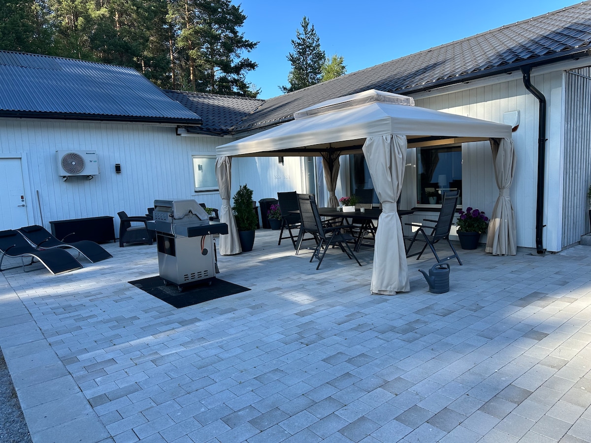 Veckorabatt och månadsrabatt erbjuds, efter överenskommelse. Luta dig tillbaka och koppla av i detta lugna, eleganta boende. Modern interiör, med kreativ design. Trivsel genom hållbarhet från en välisolerad byggnad med vattenburen golv-bergsvärme. Drick morgonkaffet med 100m till havsviken, jobba med snabbt Wi-Fi, motionera längs vattnet, utegymma eller sjunk ner i soffan för en stunds bokläsning, smart-Tv tittande. 2 byggnader: Hus och sidohus vent.& värmeväxlare med en extra enkelsäng