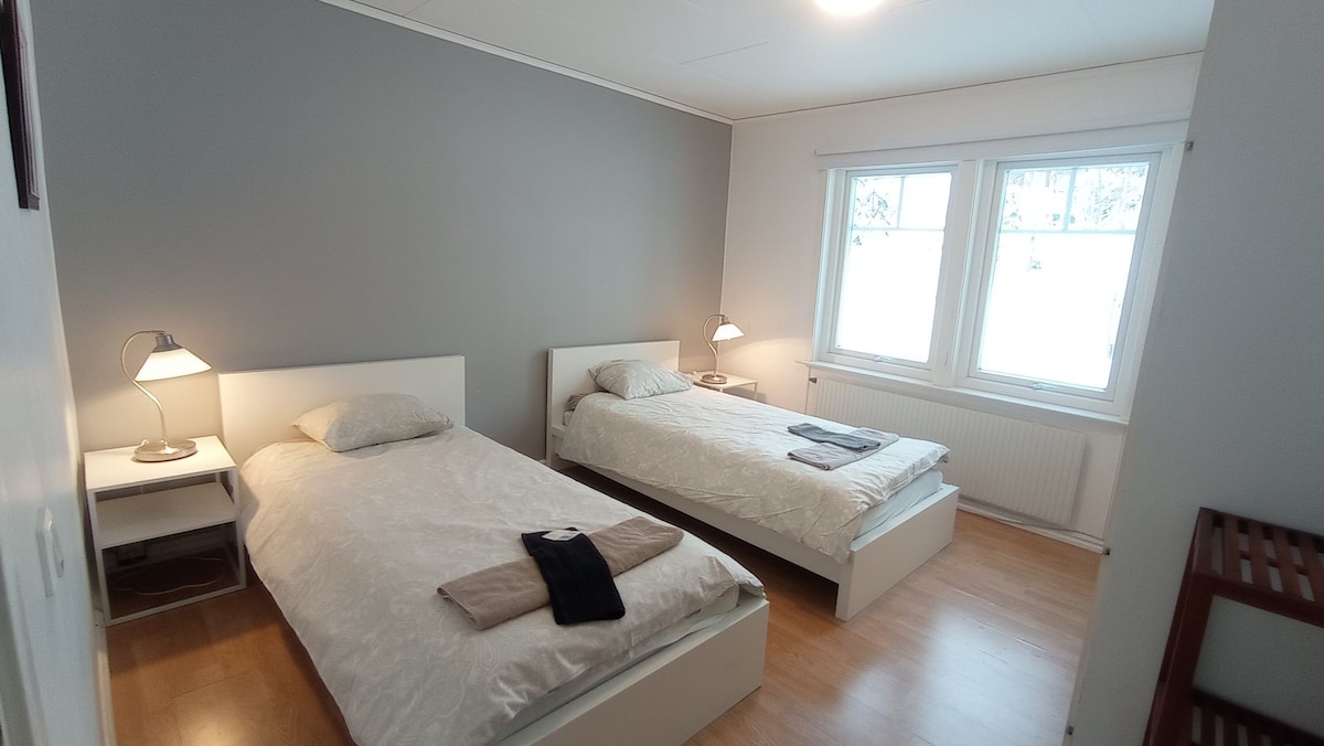 Apartment beautifully situated next to lake with bathing area and good fishing waters. Own entrance five steps down in single-family house. Two bedrooms, fully equipped kitchen with dining area, hall/desk area, shower and WC. TV with Chromecast. Free wifi, 1gb fiber connection. - Free parking - Regular wall routlet for engine heater/EV charge at cost price - About 100m to the bathing area - Free loan of bike, kayak and rowboat in summer - Easy check-in via a locked key cabinet - Self catering