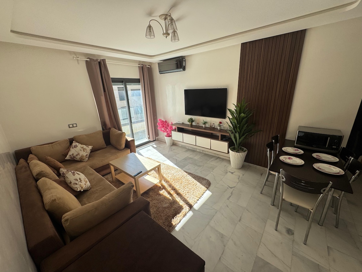 Experience luxury in this prestigious apartment situated within a newly constructed building. Nestled in the tranquil upper area of the lively Agdal neighborhood, this spacious apartment is perfect for your capital city stay. It comprises a generous bedroom with an ensuite bathroom, a welcoming living area with an additional guest bathroom, outdoor space, and a highly functional kitchen. Furthermore, you'll find all the essential amenities for a nice stay, wifi, dishwasher, washing machine etc