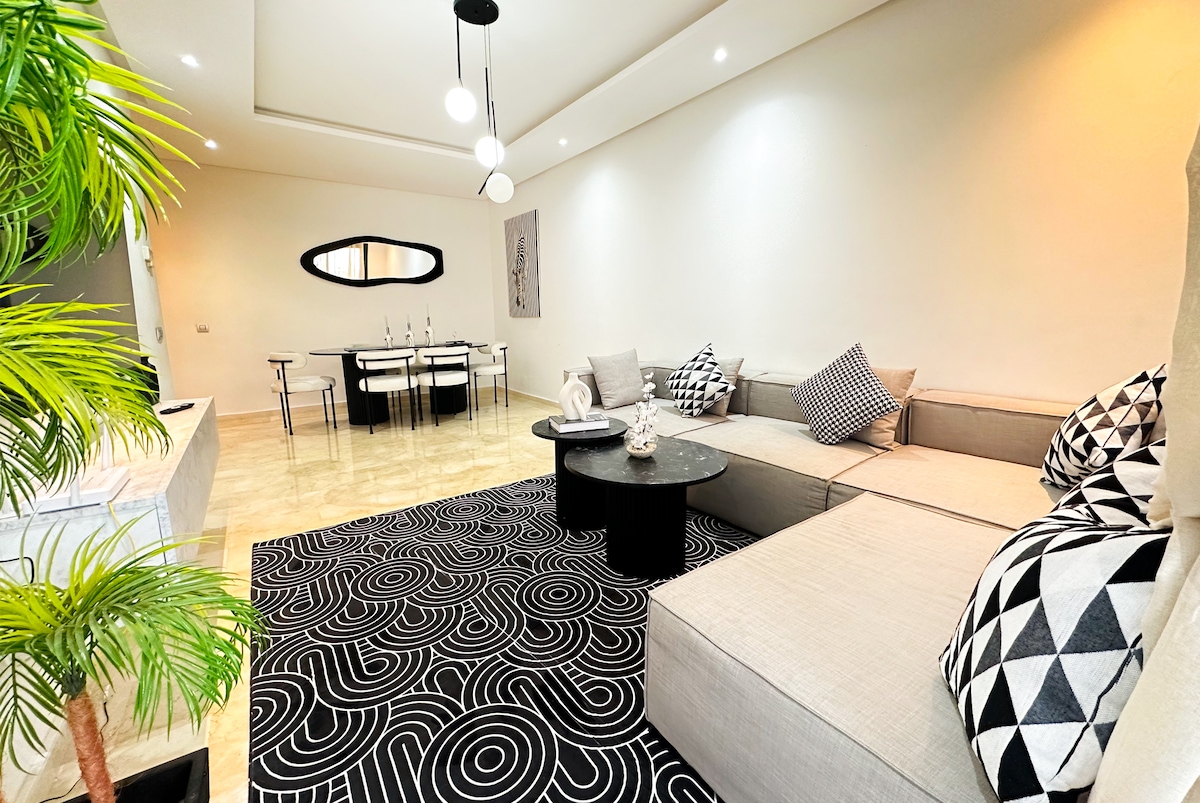 🌿✨ App 𝟮 𝗷𝗮𝗿𝗱𝗶𝗻𝘀 𝗽𝗿𝗶𝘃é𝘀 & 𝟯 𝗽𝗶𝘀𝗰𝗶𝗻𝗲𝘀 𝗲𝘁 𝗕𝗕𝗤 – à Hay Riad / 120 m² en rez-de-jardin, dans l’un des quartiers les plus prestigieux du Maroc ; Accueille jusqu’à 5 personnes {Les couples marocains non mariés ne sont pas autorisés}