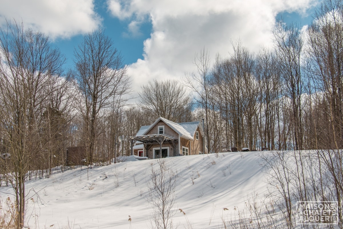 *$* WINTER PROMOTION *$* For a weekend reservation (Fri. & Sat.) the 3rd night on Sunday is $90.00!. Monumental open concept, in the heart of nature. Access to trails directly behind the house. Wood stove, large modern bathroom, one bedroom + sofa bed. Another sofa bed in the living room. Ideal chalet for a couple with children or two couples. Wild birds, turkey, and deer lovers welcome! Wifi and EV charger included. Dogs Welcome! CITQ : #308038