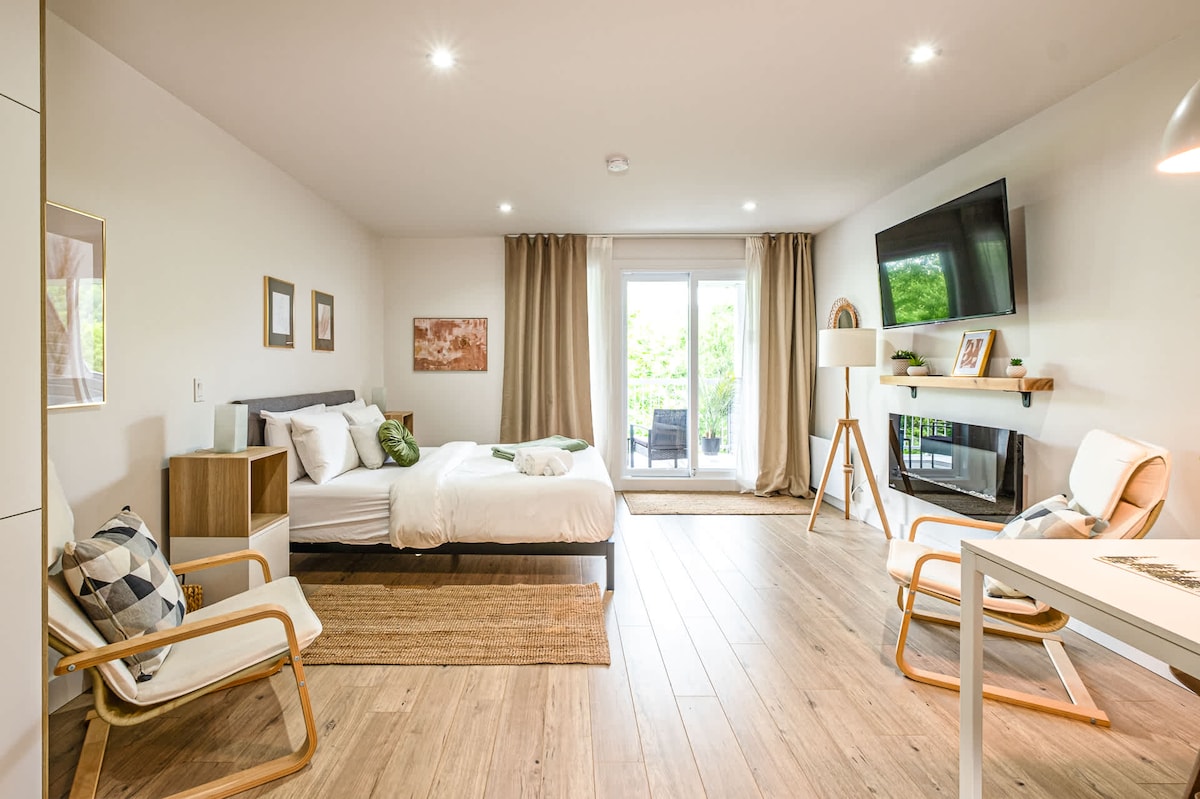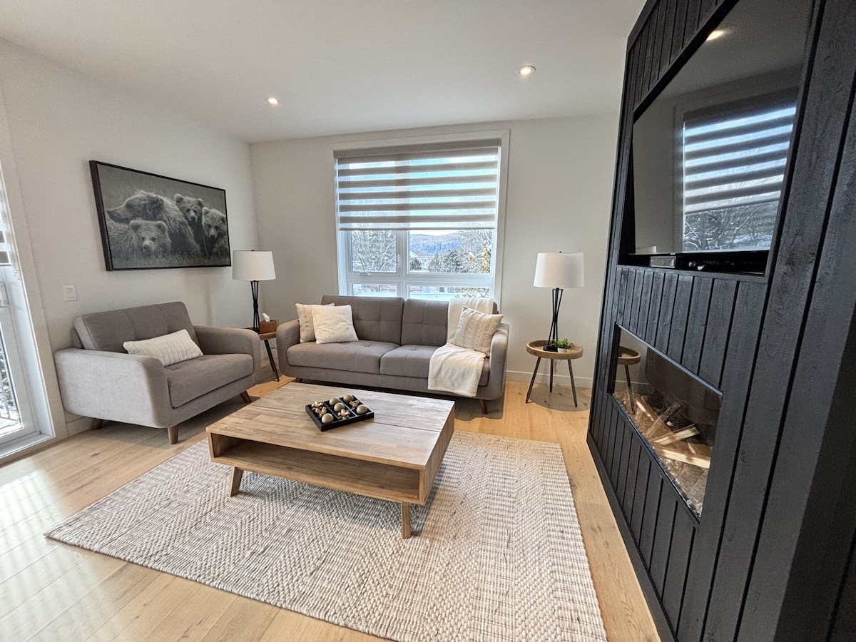 THE DOWNTOWN📍at the heart of everything: ✔ FREE shuttle → Stop outside 🚌 14 min Tremblant Ski Resort🎿 ✔ 11 min Mont-Blanc 🏂🚗 ✔ Remote-work corner 💻 ✔ Equipped kitchen ✔ Smart TV 📺 ❄️ WINTER ● View of illuminated skating rink ⛸️✨ ☀️SUMMER ● Semi-Private Rooftop terrace = views 🌇 ● Public square: Market 🥕 Water Play 🤸♀️💧 Live Shows 🎶 ● Wall A/C in living room + fans in bedrooms ❄️ ● 3 min Bike & BMX park 🚴♂️ ● 5–10 min Golf (Maître, Bête, Géant) ⛳ ● 12 min Mercier Beach 🌊