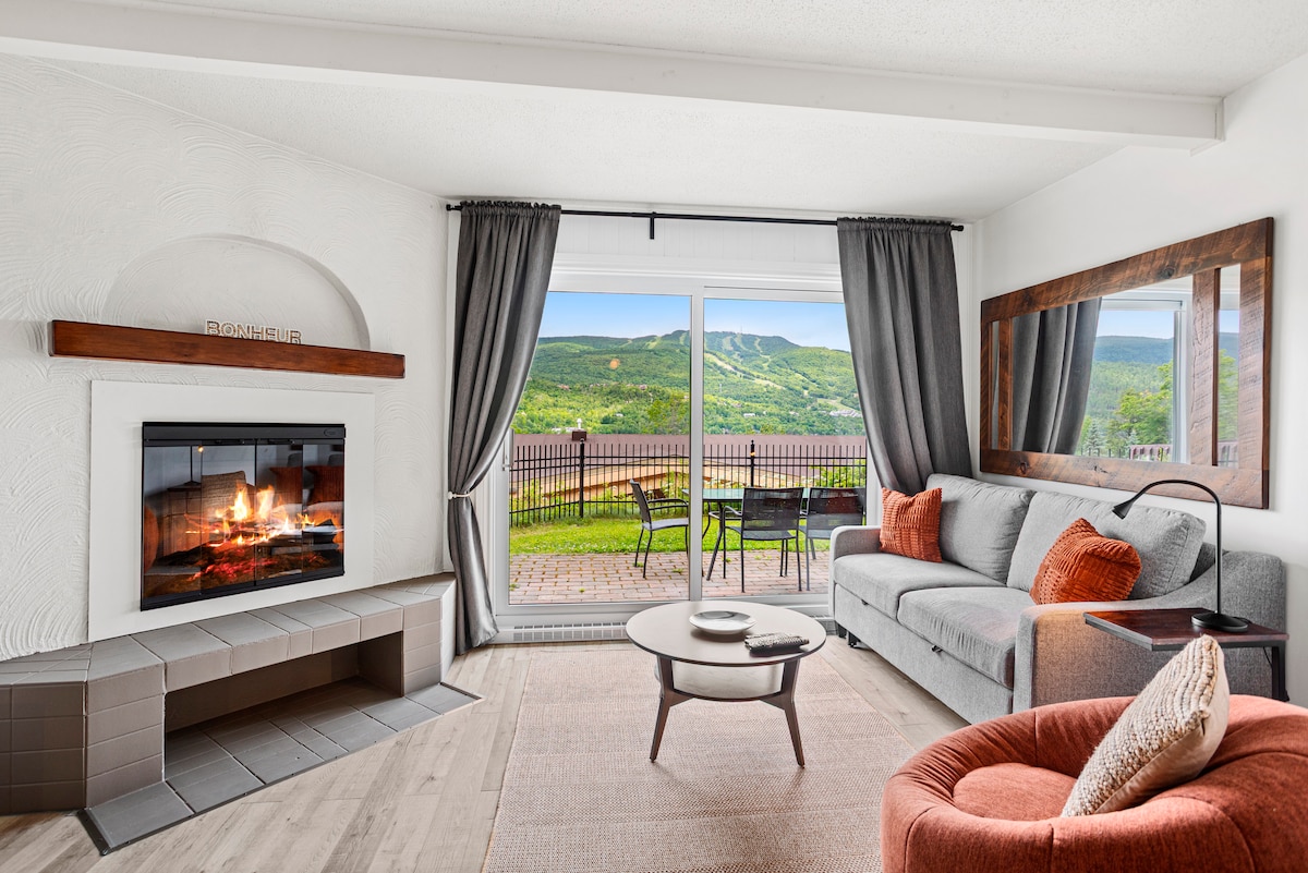 1 Bedroom Condo: 1 Queen Bed in the Bedroom + 1 Queen Sofa Bed in the Living Room. Private Balcony with a Mountain View and Surrounded by Forest! Great Location in the Old Village of Mont Tremblant just 4kms from the Ski Hill. Nearby Restaurants, Café, Bar, Groceries, Spa Scandinave, Petit Train du Nord trail. Free Parking, WIFI (high speed), Smart TV w Netflix/Youtube, Work Desk, Electric Fireplace, Fully Equipped Kitchen, Dinning Table for 4. No Smoking and No Pets allowed. CITQ301062.