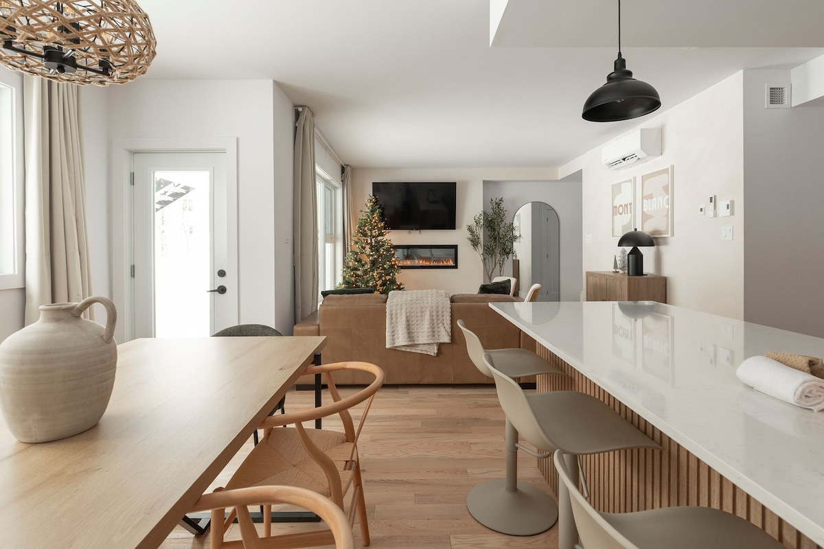 Escape to Altitude 170-1, a luxurious 2-bedroom, 2-bathroom condo that sleeps 6, offering the ultimate ski-in/ski-out experience at Mont-Tremblant Resort. Enjoy breathtaking mountain and lake views from the expansive terrace, complete with a private hot tub and outdoor gas fireplace. This corner unit boasts a spacious living area with a wood fireplace and a fully equipped kitchen. Steps from shops, dining, and slopes, Altitude 170-1 is your perfect blend of comfort, luxury, and convenience!