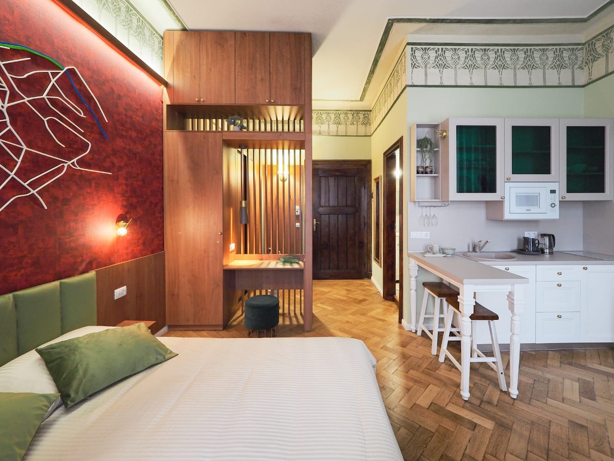 Born from the 12th century inheritance of Saxon settlers, inspired by the German fairy tales told by local merchants under the Eyes of Hermannstadt since the 18th century, Hansel Studio brings you exclusivity with attitude. An affordable luxury unit invites our guests in a warm, comfortable and modern atmosphere in the central area of our medieval citadel, in the middle of the main touristic attractions.