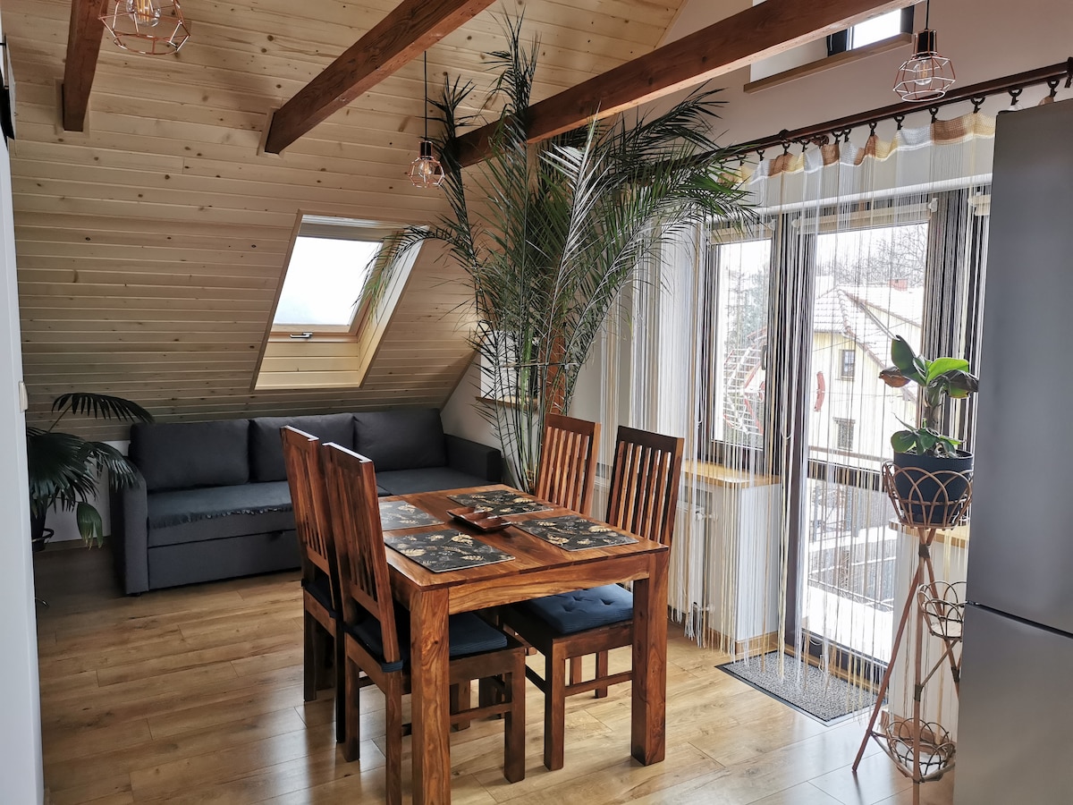 Chose our place if you like modern apartments with a cozy atmosphere. Our place can serve you as your holiday spot and be your place to work remotely, taking advantage of being close to the mountains. You can plan your daily excursion with the help of a giant map of Beskid Niski on the wall and afterward relax with a glass of wine in front of the fireplace. The apartment is located on the ground floor of a new building "Villa Wierch" in Krynica Zdrój, walking distance from many attractions.