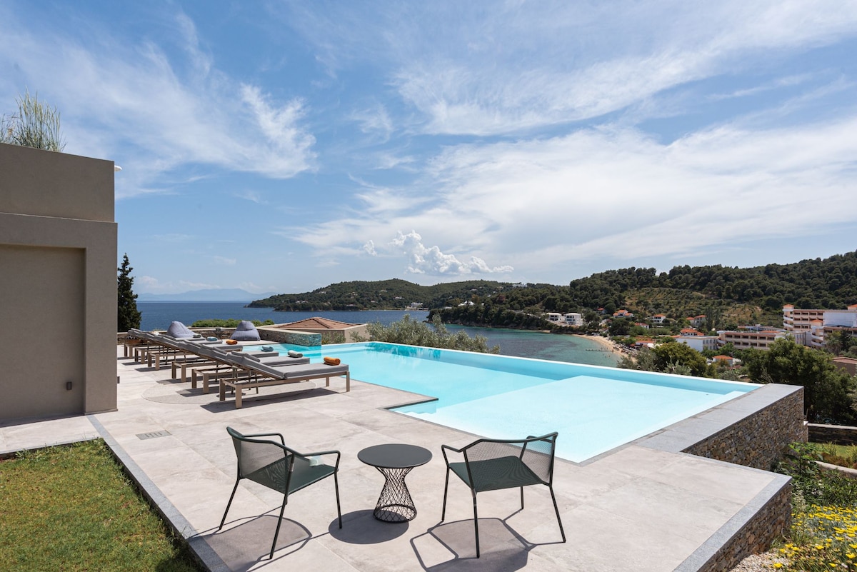 The mesmerizing Pelagoon Villa in the quiet village of Achladies on Skiathos Island, is a beautiful example of minimalism and contemporary architecture. The chic home boasts sublime views over the glistering Aegean Sea and is easily one of the most exceptional villas on the island. Set among olive trees and verdant greenery, it is the perfect haven for those seeking tranquility and seclusion during their stay.
