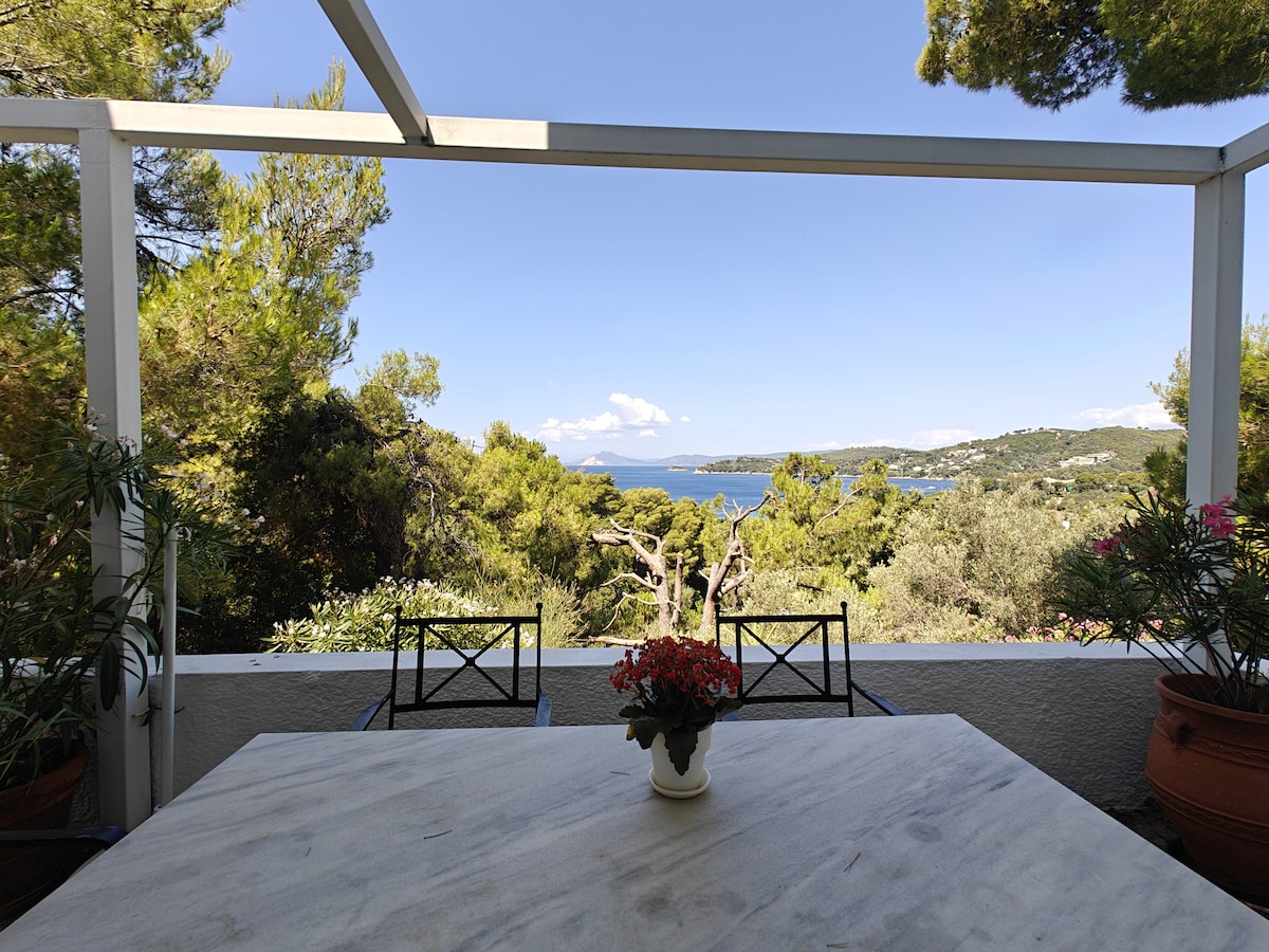 In a superb and quiet location, the lovely villa Gisele has stunning views down the hill the sea to Tsougrias and Skopelos islands. 6 bedrooms, 4 bathrooms, kitchen fully equiped, spacious living room and a beautifull terrasse with breathtaking views