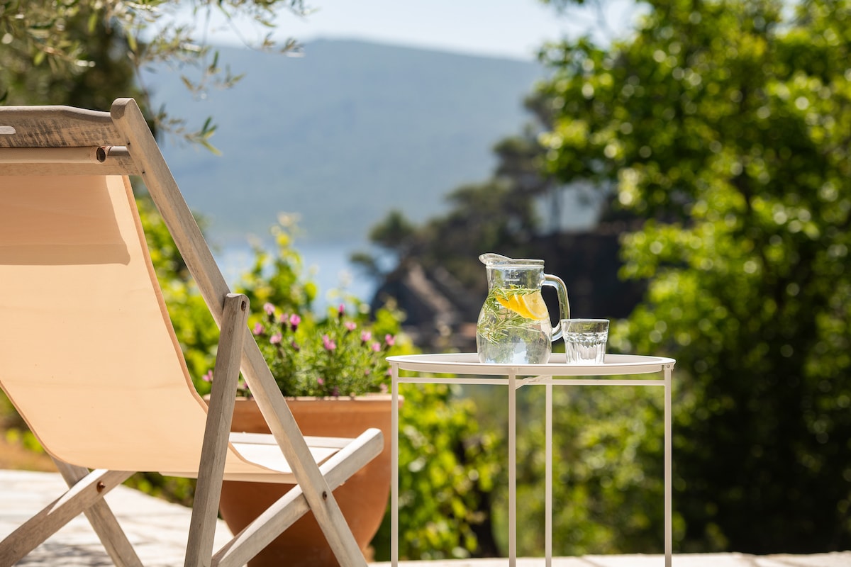 Ysyhia is modern, bright and airy & has a private pool which is the perfect size for flopping about in. The cottage comprises one open-plan living space including kitchen, dining and lounge, plus separate bedroom and bathroom. It is set in olive and almond groves and looks out across the sea. 1½km from the village, no other buildings are visible from here. Our house is up the hill on the same plot. Each house has its own private access and a fence separates the 'farm' from Ysyhia and its garden.
