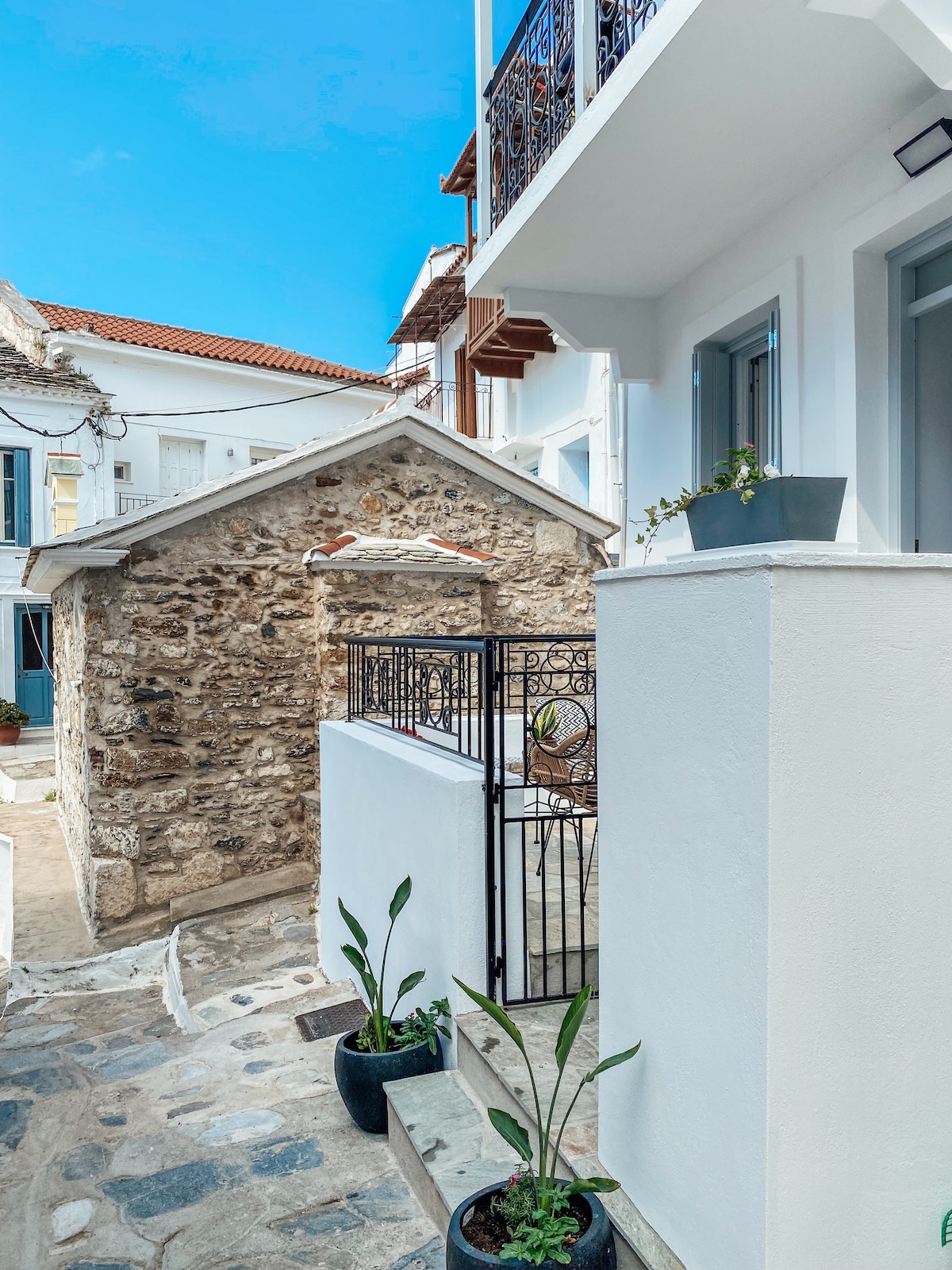 Χαλαρώστε στη σουίτα μας που βρίσκεται στην πιο αρχαία και παραδοσιακή γειτονιά της Σκοπέλου στη περιοχή του Χριστού!!Εδω θα ακούσετε μόνο τους ήχους των ντόπιων καθώς δεν κυκλοφορούν οχήματα!!Η πρόσβαση γίνετε από τον Μύλο όπου υπάρχει ελεύθερος χώρος για να παρκάρουμε!!Απο εκεί κατεβαίνουμε πολύ λιγο.Επισης ενας δευτερος δρομο πολύ κοντινος για το κέντρο είναι το πηγαδάκι!!!Ειμαστε ακριβώς στη καρδιά της παλιάς χώρας!! Θα ενθουσιαστείτε με το γεγονος οτι τα σκουπιδια συλλεγονται με αλογο !!