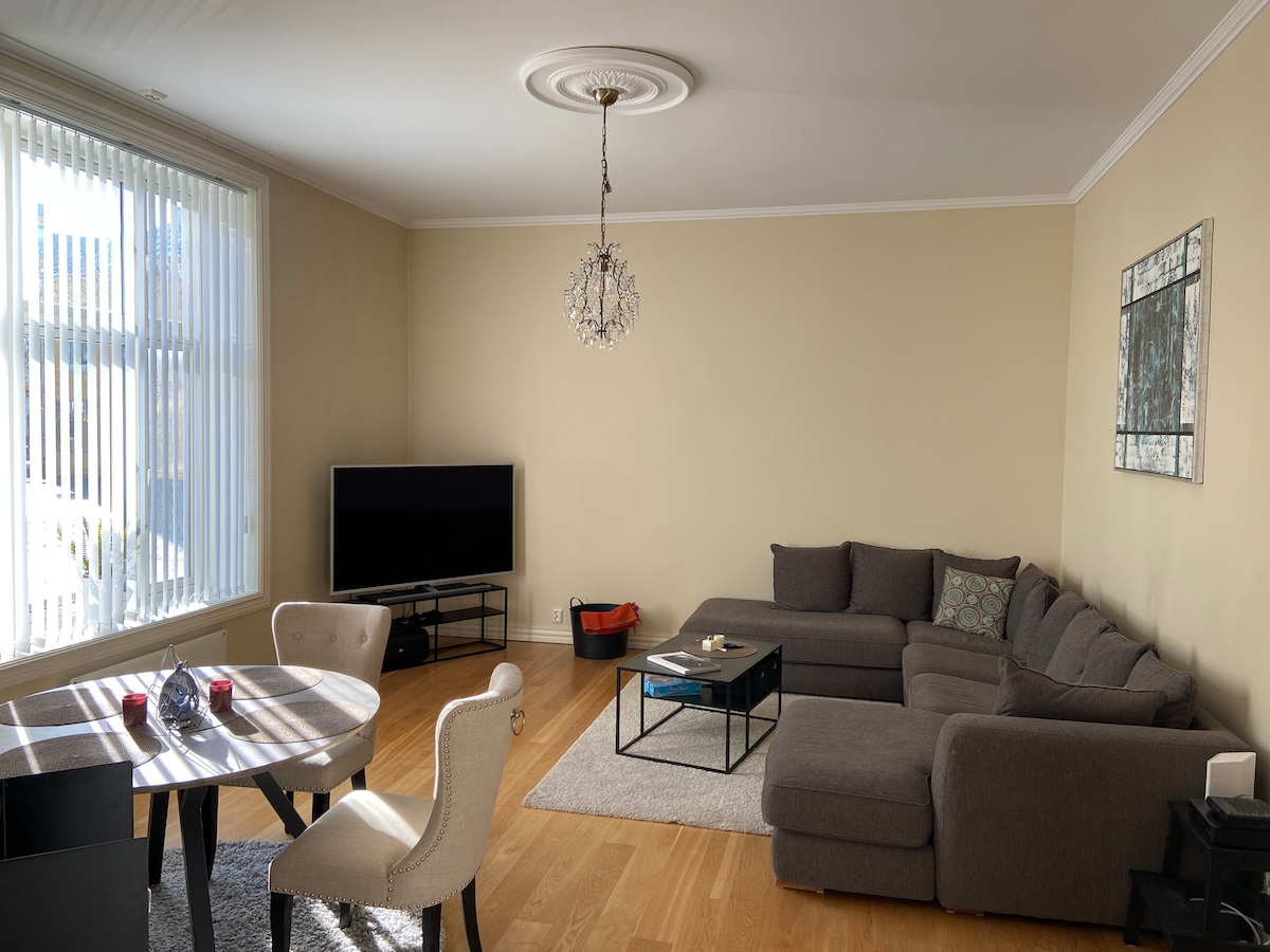 NO SMOKING! Koselig leilighet med uteplass og alt du/dere trenger av fasiliteter. Unik beliggenhet. Midt på Bryggen i Holmestrand, bare 200 meter fra togstasjonens sørlige inngang. Buss til Horten og Tønsberg. Verandadøren leder til terrasse og en vakker park med bord og benker og utsikt til havnen. Gangavstand til alt du trenger som matbutikker, restauranter/café’r, apotek, vinmonopol, strand, beach volley. Småbåthavnen er kåret til Norges beste. Blant steder med flest soltimer i Norge.