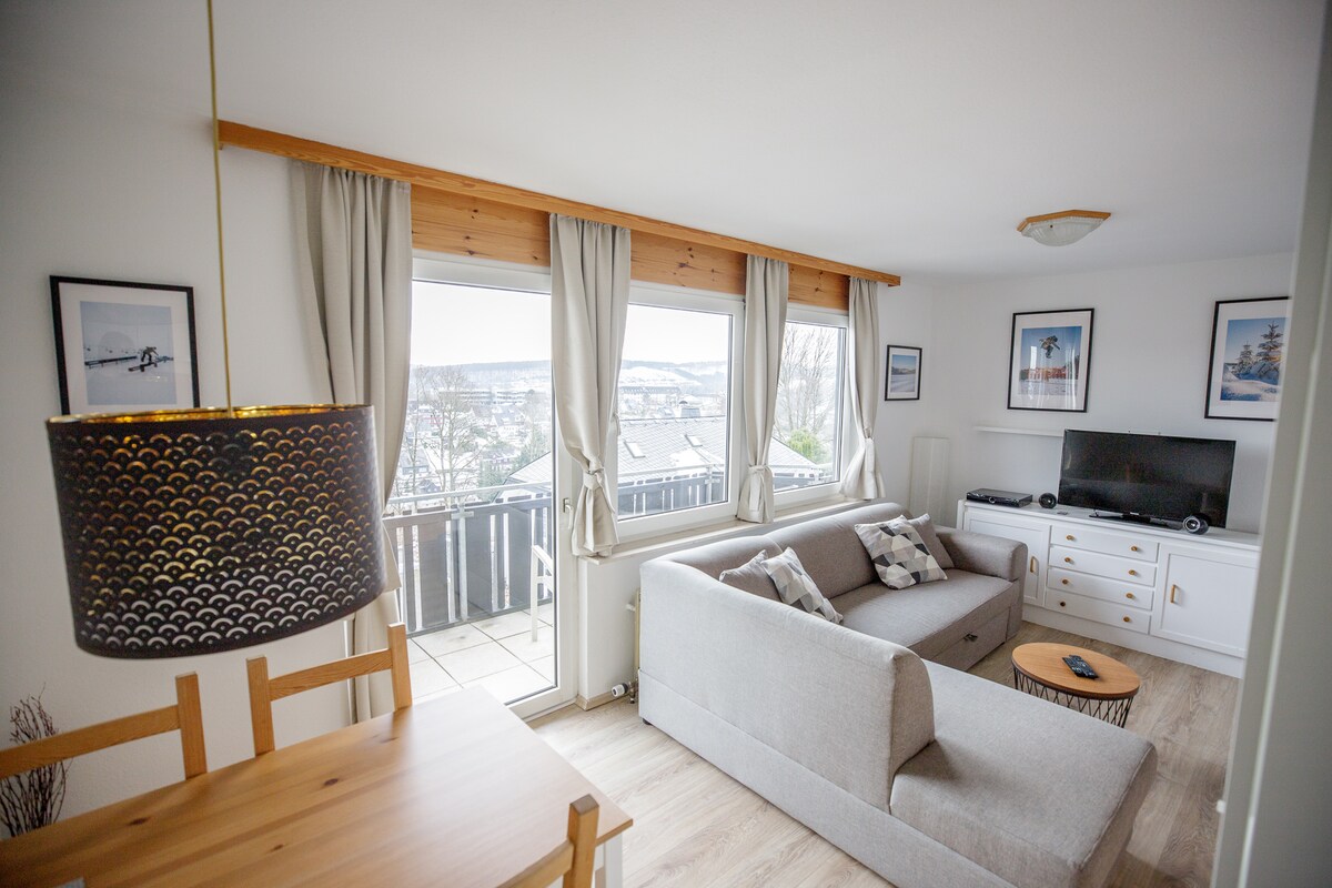 Gepflegte und gemütliche Ferienwohnung in fußläufiger Entfernung zum Zentrum in Winterberg (5 min) und zu diversen Skipisten und Wanderwegen (5 min) - Entspannung und Ruhe garantiert. Die Wohnung, mit eigenem PKW-Stellplatz, liegt in einem ruhigen Mehrfamilienhaus und hat eine Wohnfläche von etwa 60qm, aufgeteilt in Küche, Bad, Wohnzimmer mit Schlafcouch, Schlafzimmer und Flur. Die an das Wohnzimmer grenzende Terrasse lädt im Sommer zum Entspannen ein.