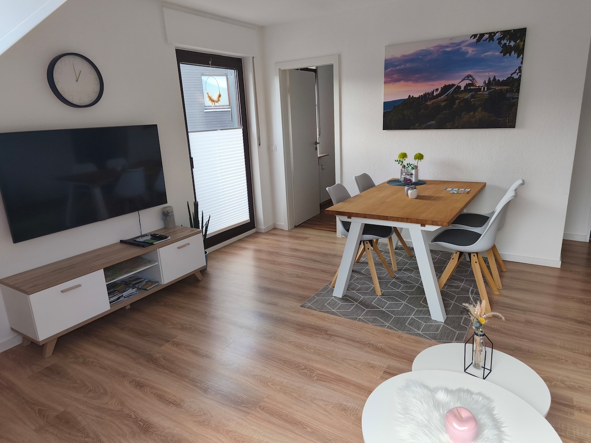 Ferienappartement Winterberg - In ski boots directly into the ski lift carousel! By bike directly to the bike park! Cosy holiday flat that is perfect for your holiday in the immediate vicinity of the ski slope and the bike park. The vibrant centre of Winterberg-Stadt can be reached on foot in 15 minutes. Our holiday flat offers space for up to 4 people and has a bedroom, a living room with a fully equipped kitchen and a bathroom.