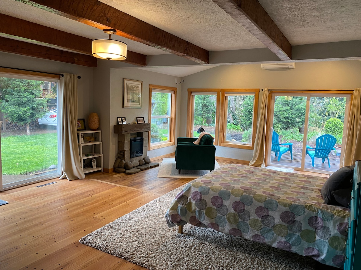 Cozy up in this sunny studio located in the Friendly neighborhood. Snuggle up in the comfy queen bed by the gas fireplace. A wine fridge chills your food and beverages. A private full bathroom—separate from the studio—is accessible by a 40-foot lighted and partially covered walk to the garage. Enjoy the quiet back yard, patio, and garden. Restaurants, shopping, and parks are within a short walk. We welcome up to two well-behaved guest dogs with responsible owners.