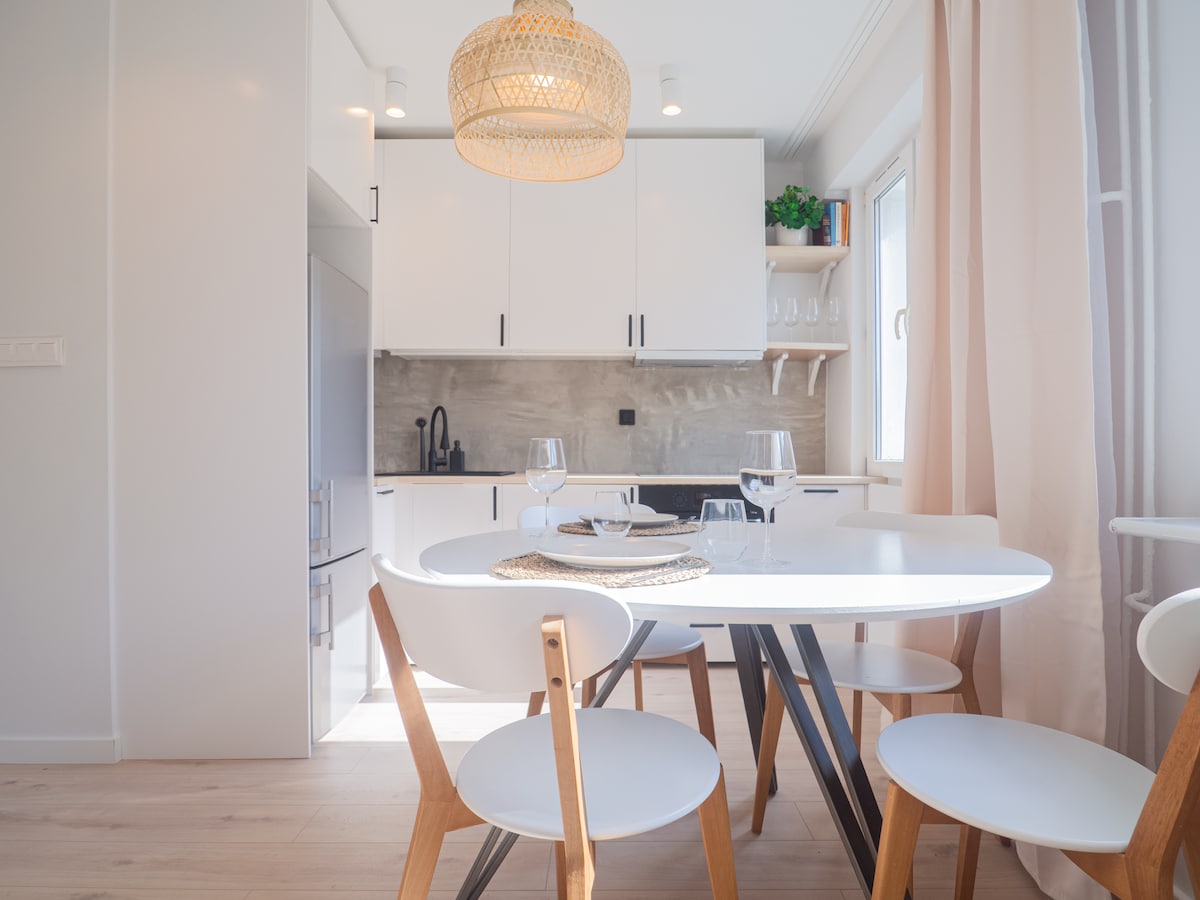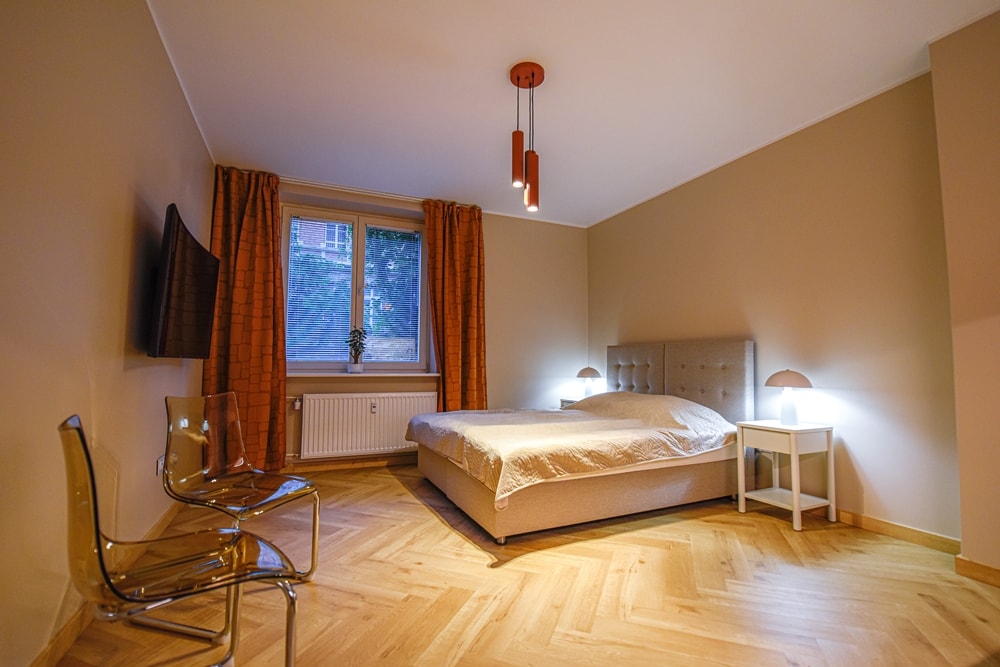 We invite you to a stylish apartment in the heart of Poznań at Swiety Marcin. The apartment is freshly renovated, designed by interior designers with attention to detail. It has a fully equipped kitchen, a beautiful bathroom, a large living room with a comfortable sofa, a table with chairs and a smart TV. The bedroom has a large double bed (160x200cm) and wardrobe. Apartment is located on first floor and is very quiet, because it is located in the courtyard.