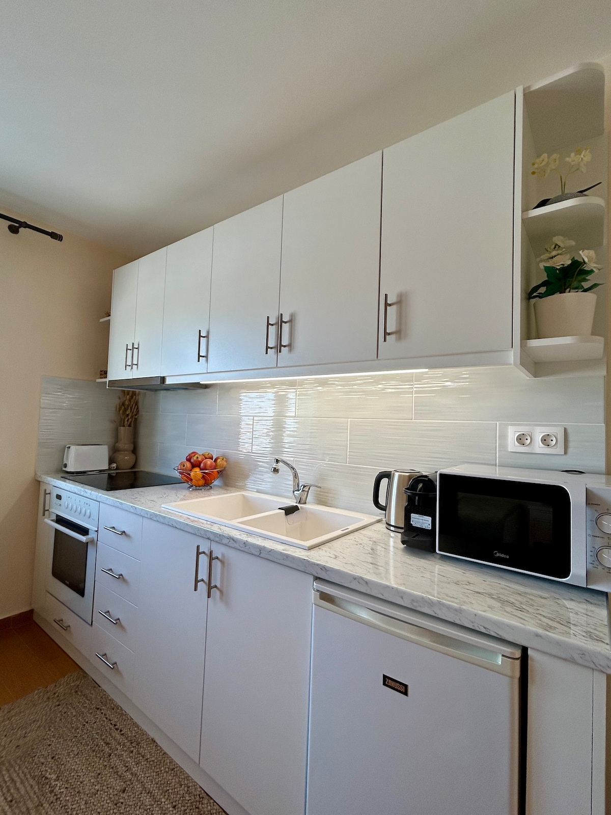 Aegeon apartment is located in the heart of Skiathos town, 100m. away from the port, right across the marina, and offers a great view of the port, Punta, and Bourtzi. The apartment is bright and cosy and features one bedroom with a double bed, one bathroom, an open plan kitchen, living room and a balcony. There are also 2 couches on the living room which can be used as beds. The apartment is also equipped with A/C, tv and wifi.
