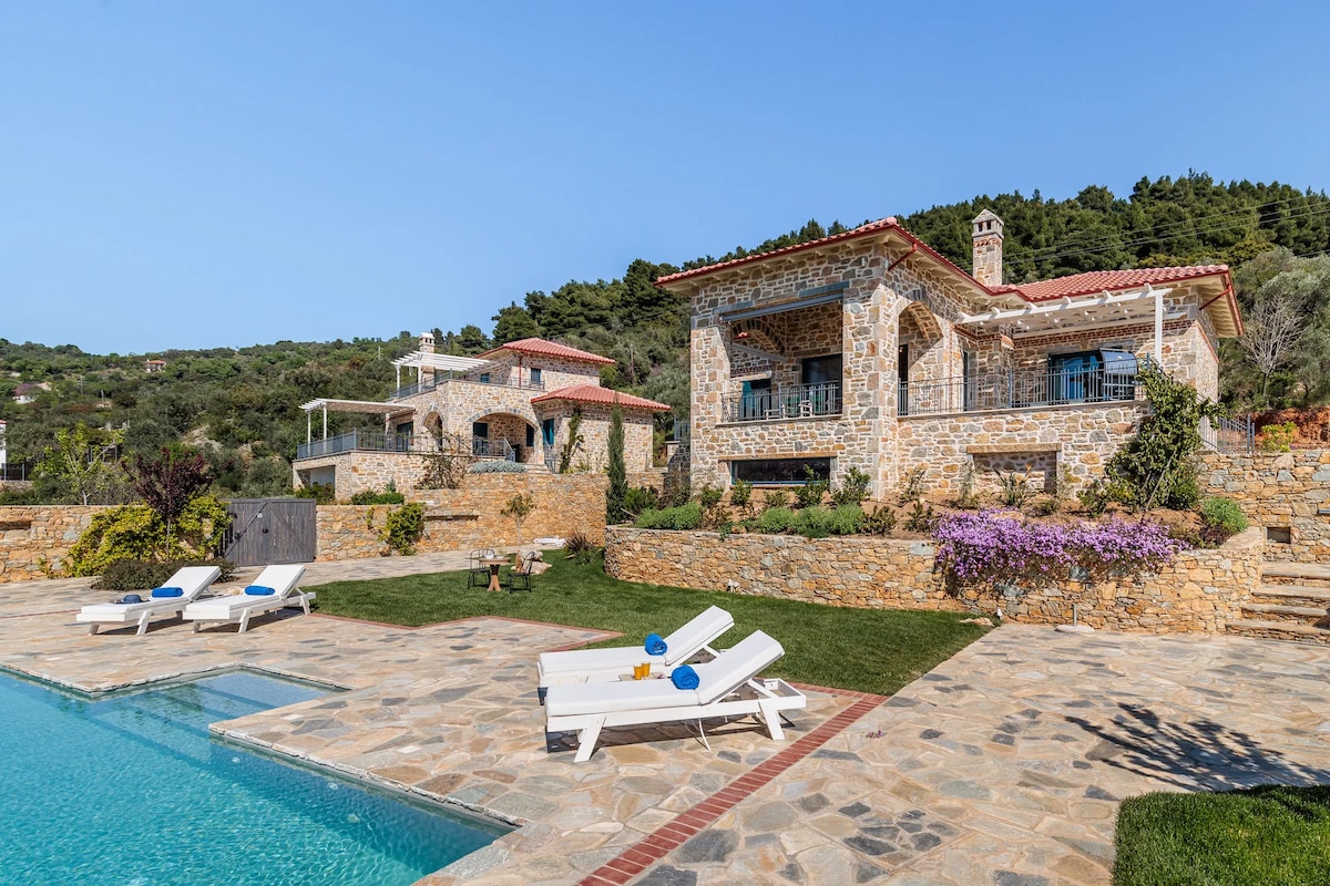 Peaceful pool villa, two floors, spacious, 800m from Stafilos beach, 4 km to Skopelos town and port.There is private infinity pool. The house is set in its own fenced grounds with fabulous views across the Aegean and is surrounded by almond and olive trees. You are free to walk over the private grounds. It is reached from the main road through a 500m long dirt road .The place is good for couples, families,nature lovers . Fast Wifi. Both bedrooms and living room are airconditioned.