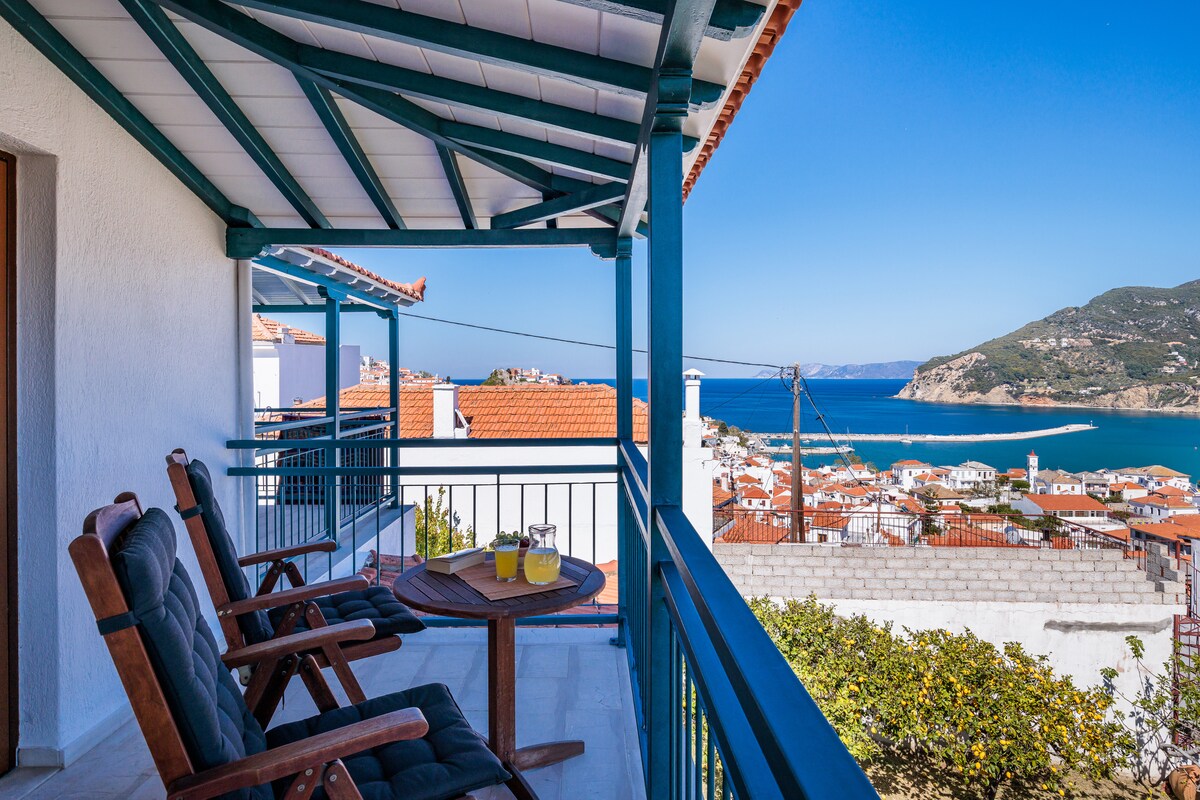 Our house is in a lovely location on Skopelos Chora. The external large terrace offers wonderful views over the harbor and the traditional village. In total the house has 3 spacious bedrooms each one with double beds and one of them has a loft with two single beds. The house has 3 bathrooms. It can comfortably accommodate up to 8 people.