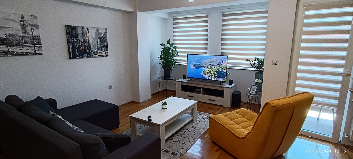 Enjoy a stylish experience at this centrally-located place This is BRAND NEW 60m2 apartment 5 minutes on foot from city park (stadium) and from the main square. Best possible location, very close to the lovely streets of Debar Maalo with many bars and restaurants. The apartment is with 1 bedroom with queen sized bed, and a living room with comfortable sofa bed + pull out bed Also 2 balconies from both rooms, one overlooking Vodno mountain. You can use it to drink a coffee or have a lunch
