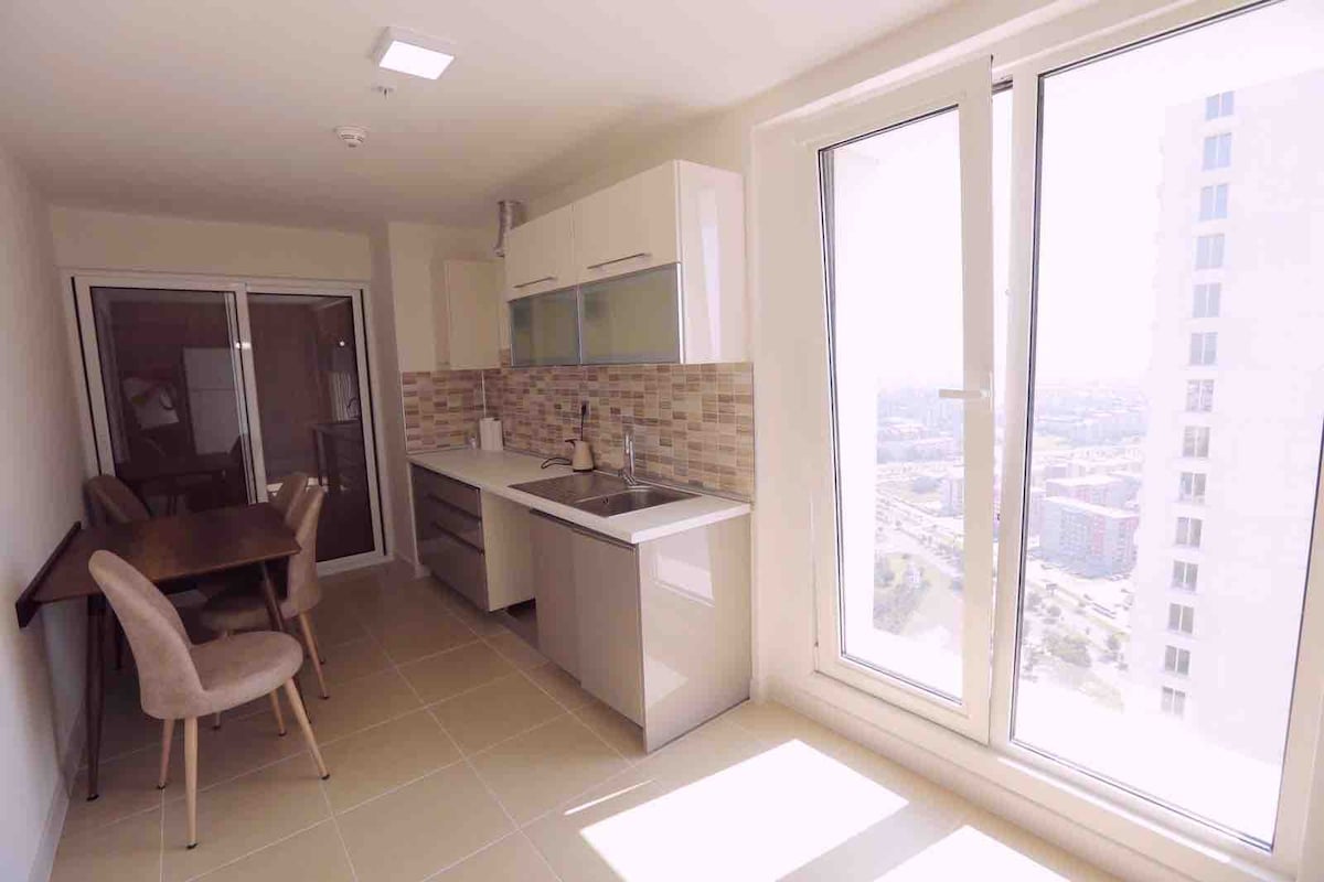 Welcome to your cozy home in the sky! Located on the 28th floor, this apartment offers amazing city views and just 4km to city center. The building is safe with 24/7 security, and free parking is included. Inside, the kitchen has everything you need to cook, and the bed is made for deep sleep with a premium mattress and pillows. The complex offers gym, sauna, spa, and a shopping mall with grocery stores, restaurants, and cafes just downstairs. I’m here to help with anything during your stay.