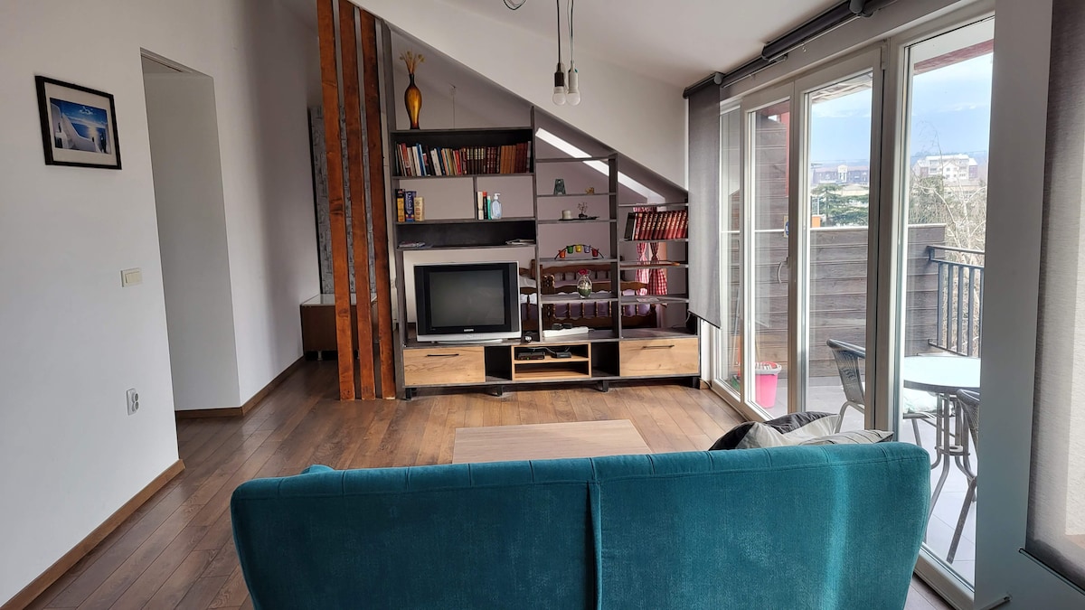 Located in the center of Skopje on a traffic-free street, this loft overviews Vodno mountain and it is just minutes walk from the city square. The neighborhood is young/trendy, close to the 'Bohemian Street', many authentic Macedonian restaurants and the bus going to 'Matka'. Carefully designed using high-quality materials, furniture, and contemporary art, this apartment has a bright light, a designated workspace area, an open plan living and dining space, and a balcony with a panoramic view.