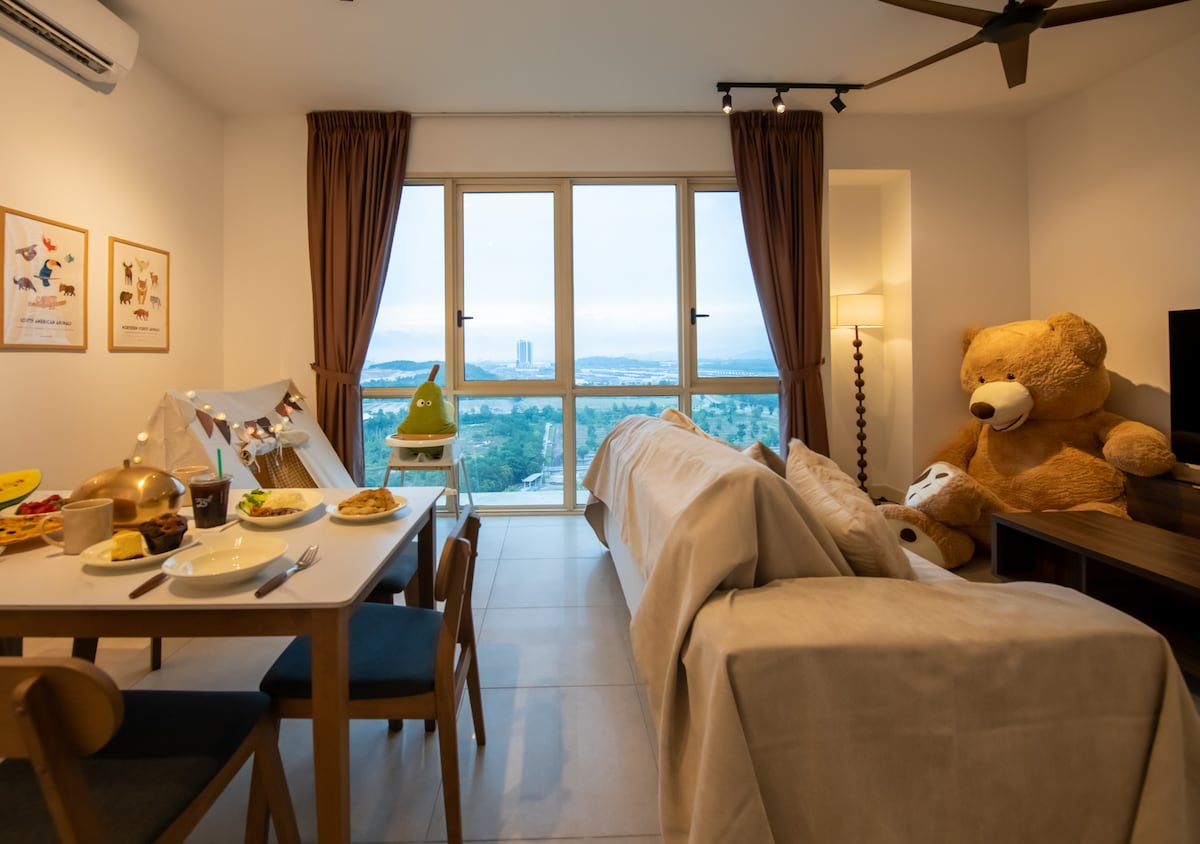 *NEW* DM me the word "New package" to enjoy 8% cashback. Escape to our stylish 2BR condo on the 33rd floor in Johor Bahru. This modern minimalist retreat offers stunning city skyline views and comfortably sleeps 6-7. Perfect for families or business travelers, it features an HD projector with Netflix, high-speed 5G Wi-Fi, and a well-equipped kitchen. Enjoy a unique urban getaway with resort-style amenities.
