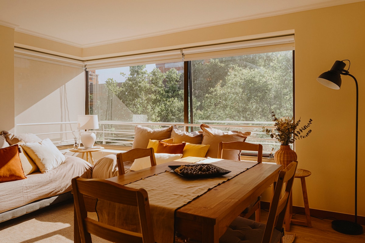 Enjoy a great experience in this save location in Barrio El Golf. Modern and cozy apartment with a privileged location, in the heart of gourmet cuisine and luxury shops of Santiago de Chile "Barrio El Golf". The neighborhood is characterized by its great architectural value and its attractive and varied cultural, gastronomic, and recreational offer. (restaurants, cafes, bars, theaters, museums, design galleries, etc). A few meters away is the metro station ¨Escuela Militar¨ and Plaza Peru.
