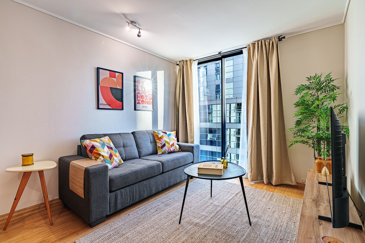 Studio, modern design, ThermoPanel for acoustic and thermal insulation, A/C. Located in the top-rated area in Santiago. Steps away from Tobalaba Metro station, from best restaurants in Santiago, from Costanera Center Mall, cafes and a supermarket. Excellent wifi, free of gas appliances, Cable TV, Smart TV 55" curved screen, nice bathroom. All in a safe neighborhood with many services. For security reasons, it is required to send us, after booking, photos of ID and selfie of each guest.