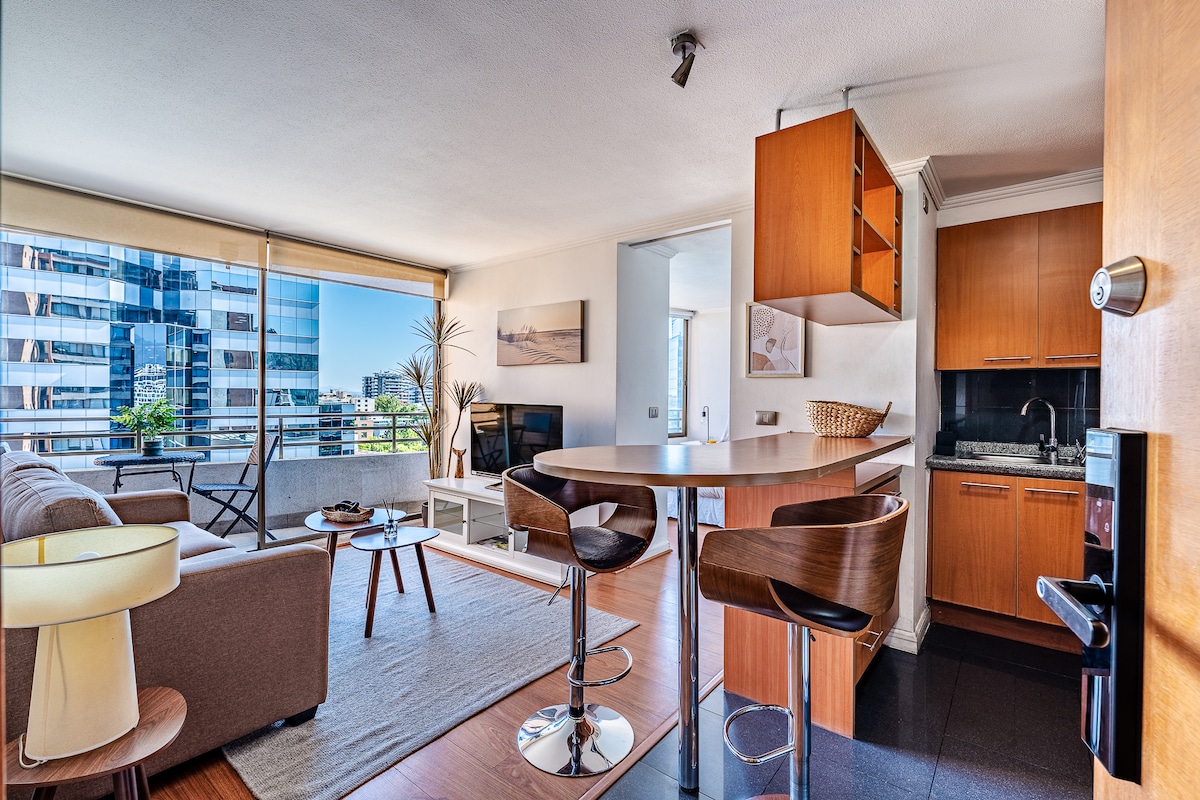 It is a one-bedroom apartment with parking in downtown Providencia. Close to many shopping places, walking distance to Metro (1 block away), restaurants, and more. If you come to work, the internet is super fast, amenities are great, and you will have an awesome view of the San Cristobal Hill from the super big apartment's balcony and the rooftop.