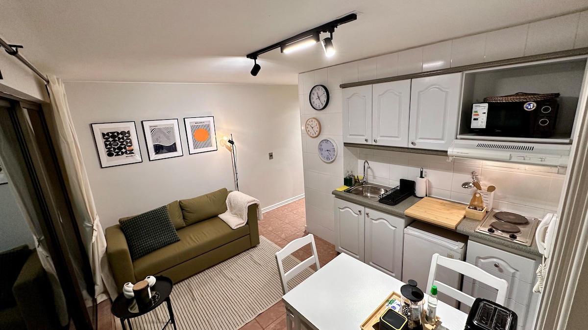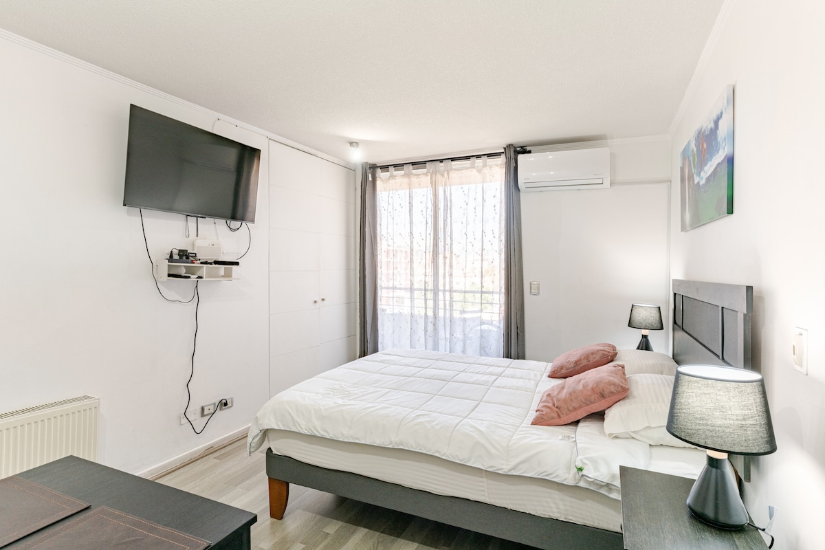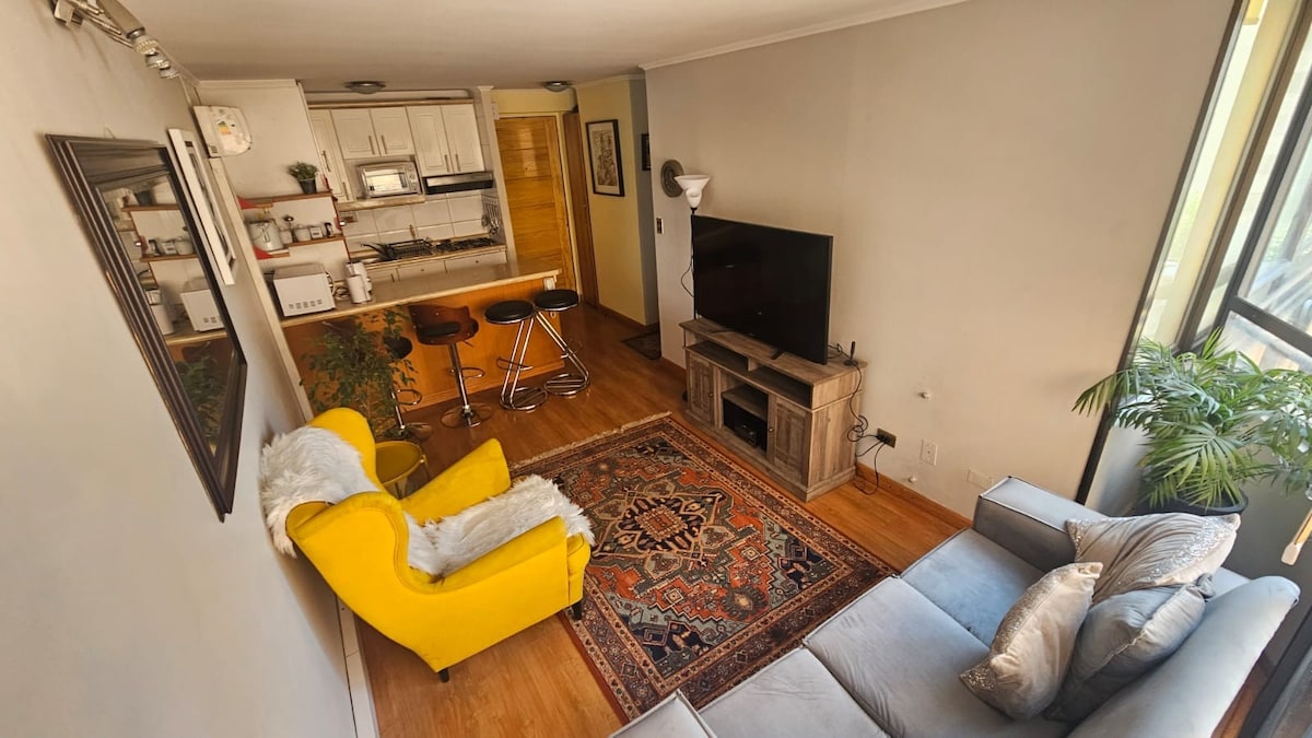 Modern apartment in Bellavista/Providencia, just steps from Metro Salvador. Perfect for couples or business travelers. Enjoy ultra-fast WiFi (561 Mbps), a bright bedroom with a double bed, a fully equipped kitchen, a cozy living room, and a private balcony with greenery views. The building offers a laundry room, elevator, and 24/7 security. Excellent location near San Cristóbal Hill, Patio Bellavista, and restaurants.