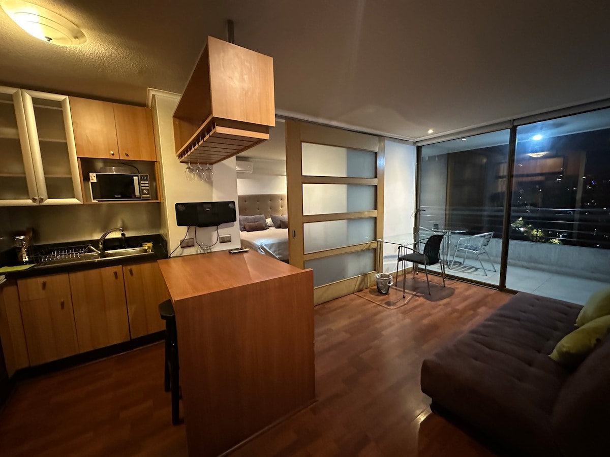 Cozy and bright department, excellent location, windows with double glass (thermopanels), nice balcony, 4 minutes walking distance to 2 lines of metro station, restaurantes, supermarket, Costanera Center Mall, two blocks from a bike path. Interiors with wooden and iron design, full equipped. Concierge 24/7. Very safe area.