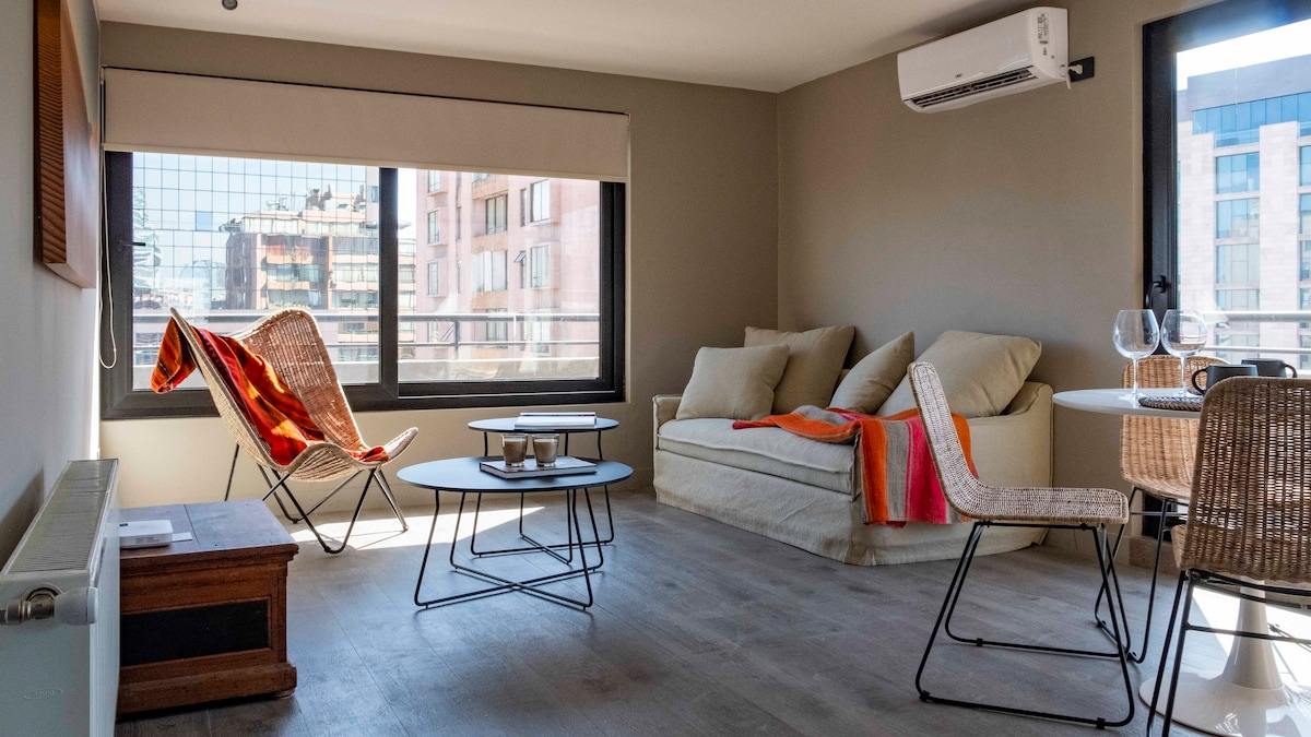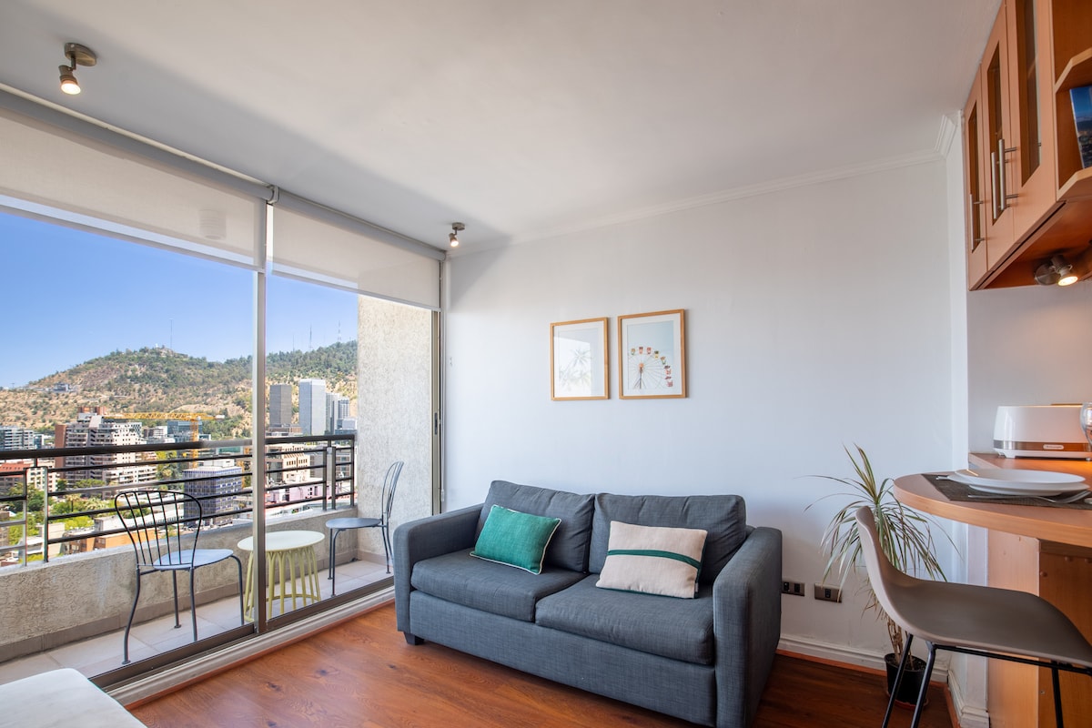 Studio, modern design, ThermoPanel for acoustic and thermal insulation, A/C. Located in the top-rated area in Santiago. Steps away from Tobalaba Metro station, from best restaurants in Santiago, from Costanera Center Mall, cafes and a supermarket. Excellent wifi, free of gas appliances, Cable TV, Smart TV 55" curved screen, nice bathroom. All in a safe neighborhood with many services. For security reasons, it is required to send us, after booking, photos of ID and selfie of each guest.