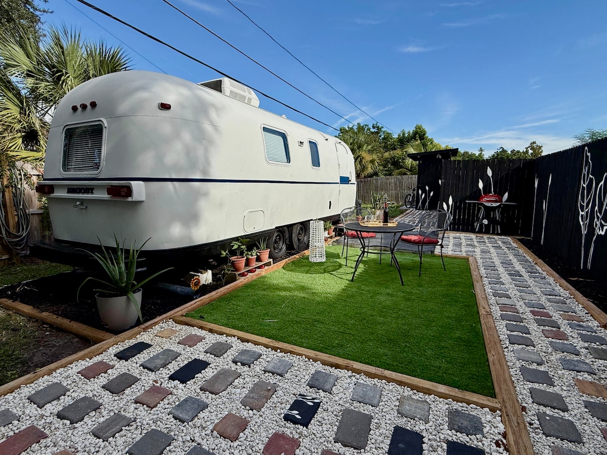 Our airstream has all the amenities you need. It is located in our one acre property behind our house (very private) the parking is on the side of our house next to our carport and you will go through a gate and follow the path to the airstream. MCO Airport 12 miles Disney parks 25 mil Universal Studios 16 mil beaches 50 mil UCF 2.4 mil Full Sail 2.4 mil Valencia 3.5 mil Dining, Shopping entertainment and much more!