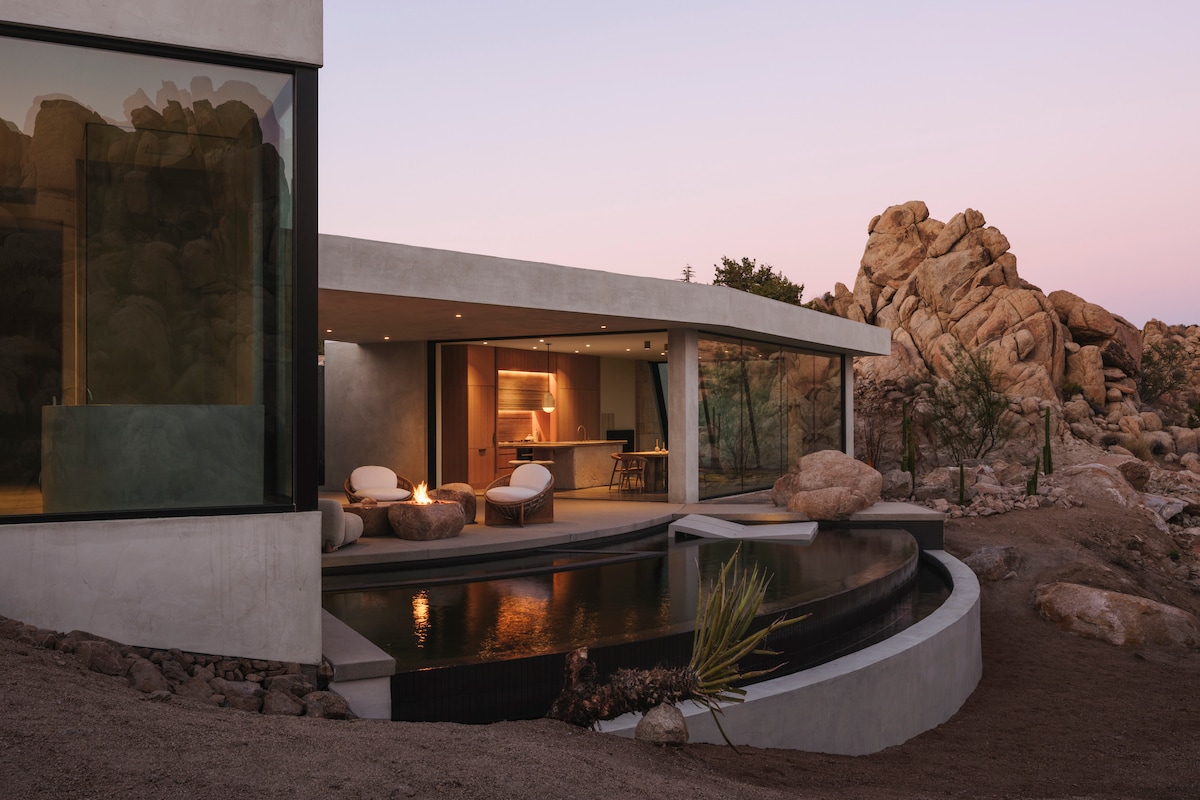 Vesper House: Luxe boulder hideaway just 3 minutes to the Joshua Tree National Park entrance. Seclusion and privacy, views in every direction and designer furnishings. Outside, enjoy a conversation by the fire pit or in the 6-person hot tub nestled at the foot of the majestic boulders. Take a refreshing outdoor shower to cool off. A BBQ grill and an 8-person outdoor dining table are perfect for hosting dinners. IG: @vesperjt