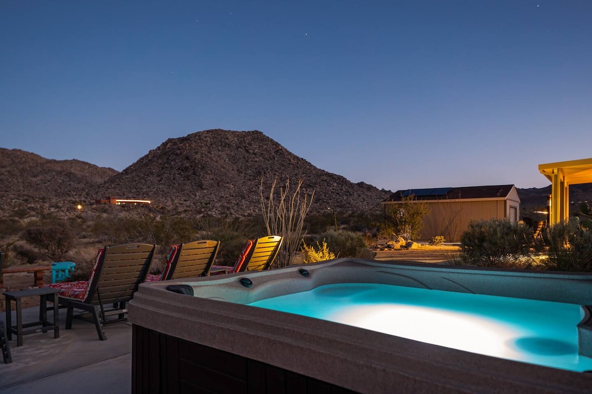 Vesper House: Luxe boulder hideaway just 3 minutes to the Joshua Tree National Park entrance. Seclusion and privacy, views in every direction and designer furnishings. Outside, enjoy a conversation by the fire pit or in the 6-person hot tub nestled at the foot of the majestic boulders. Take a refreshing outdoor shower to cool off. A BBQ grill and an 8-person outdoor dining table are perfect for hosting dinners. IG: @vesperjt