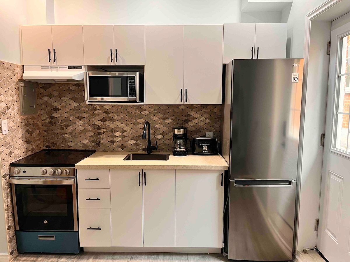 Legal Basement - This chic place comfortably accommodates up to 5 guests and comes fully furnished. There are 2 bedrooms, each accommodating 2 guests, along with a daybed in the living room for the 5th person. One bedroom offers a queen-size bed, while the other has a double-size bed. Also, there are 2 study tables with chairs, one in each bedroom and one in the living room. The meticulously designed kitchen boasts modern and luxurious touches. The stylish washroom features a standing shower.