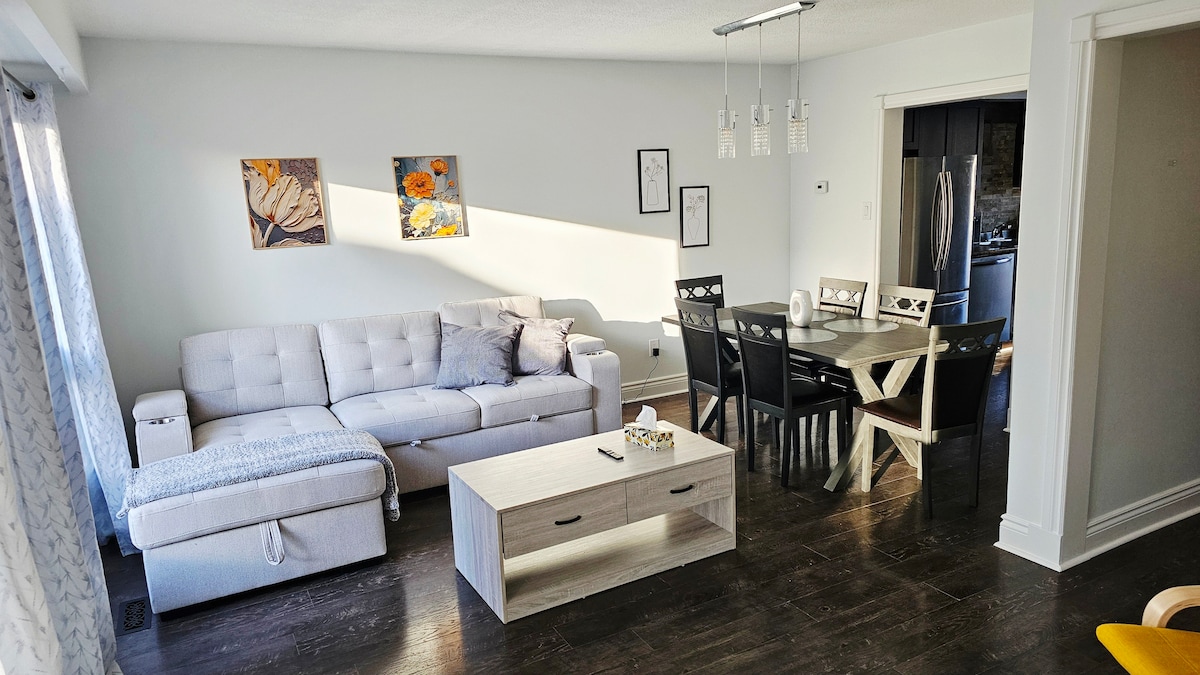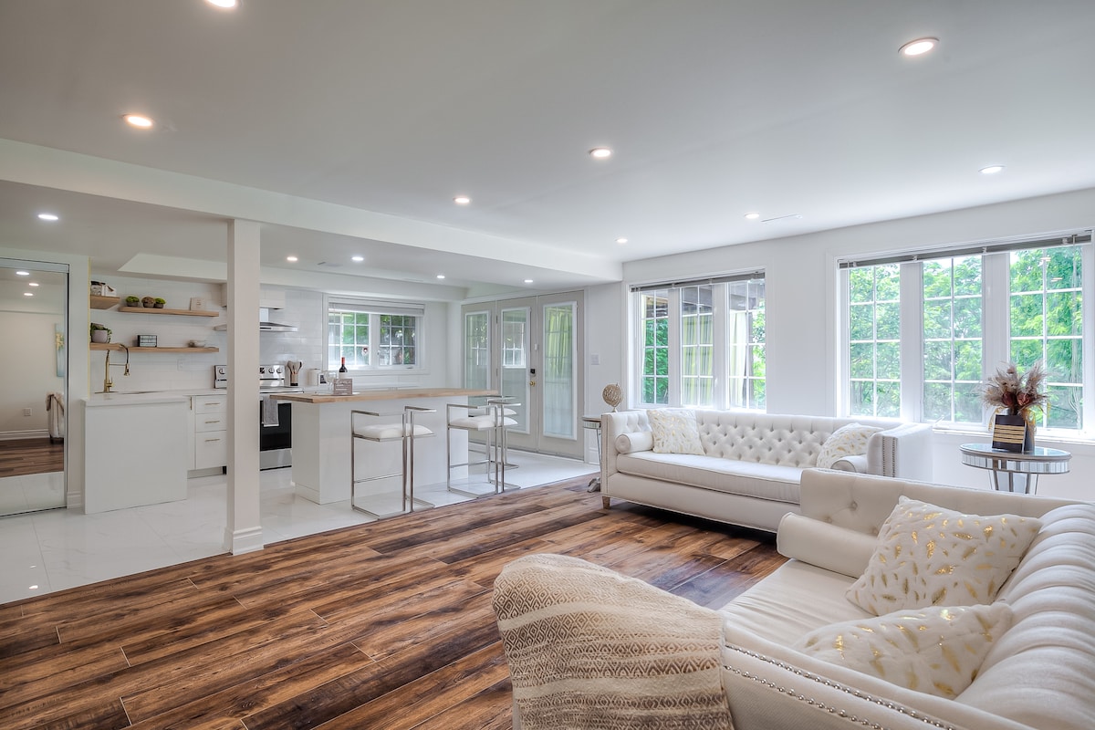 ★ "Very nice apartment! Clean, spacious, and modern'' ★ ☞ Fully Private unit!!! ☞ Fully equipped kitchen!!!! With all required machines and pots ☞ Extended Kitchen Island ☞ All rooms w/ queen + Sheets and Duvet !!!!!! ☞ 55” smart Samsung TV w/ Netflix + Samsung sound bar with Sub ☞ Central AC + Heating ☞ Onsite washer + dryer ☞ Parking → 1 on the driveway!!!! ☞ 700mbps wifi ☞ Open Concept 5 mins → Thermëa spa village 12 mins → Whitby and Ajax GO Station