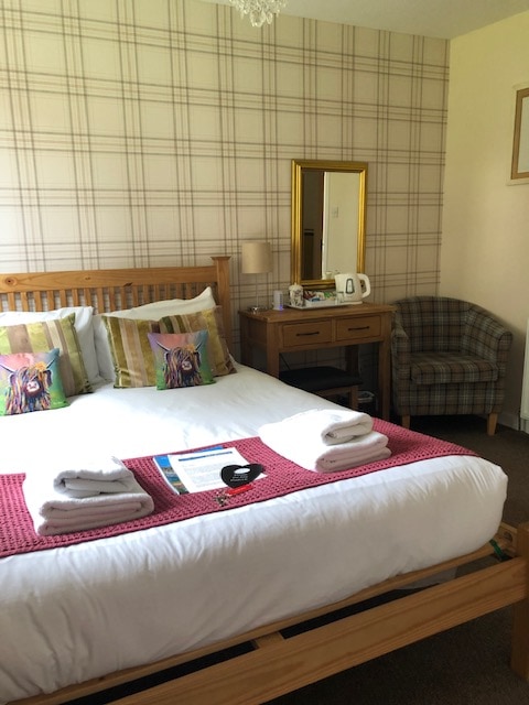 My family room has 1 double bed, and 1 single bed and a pull out bed. It can be used as a double, as a twin, for 4 adults or for a family. There is no charge for infants (2 years and under) . It has a private en-suite shower room, coffee/tea tray, tv and wi/fi. There are no self catering facilities or access to our kitchen. Breakfast is served downstairs in the dining room, usually between 8am and 9am but earlier can be arranged. Please note we are on the Mainland not on the Isle of Skye
