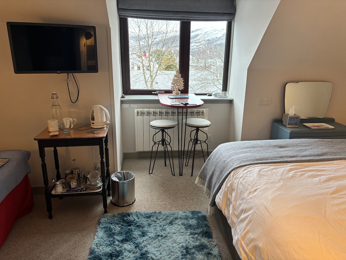 A small cosy double room and continental breakfast, set up perfectly for exploring north Skye. We are nearby the spectacular Quiraing, the beach and the Staffin dinosaur footprints; the main town Portree is a 20min drive. We’re happy to share with you about the best things to do and see – you could even book an adventure with our sister company Skye Mountaineering. Please note: the large luxurious bathroom is shared with one other room, and there's no kitchen/microwave. License No. HI-30066-F