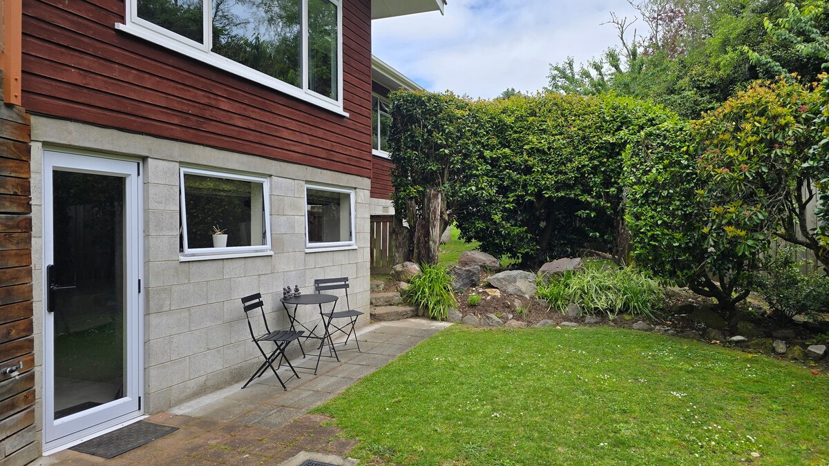 Quiet neighbourhood, with lake close by. Guests have the entire ground floor apartment to themselves with separate entrance door and private access to courtyard and lovely garden (my husband and I live upstairs). Close to Skyline Skyride/gondola, Rainbow Springs, Mitai, Canopy Tours and other tourist spots. Free Wifi. Great heating. Cereal, Milk, fresh Plunger-coffee, Tea variety, but no-cooking facilities. Lounge opens to private garden, with outdoor table and chairs.