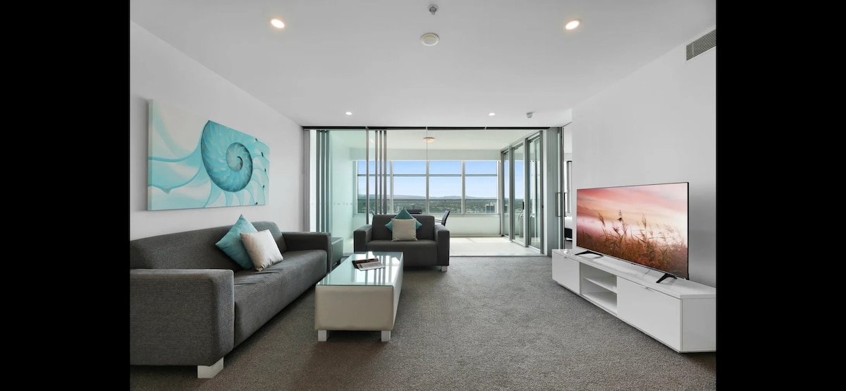Unobstructed endless views of magnificent beach, rolling waves and the plane acrobatics from ALL rooms. 21st Floor. Let the waves lull you to sleep Homely large BEACHFRONT unit with full Balcony, Car Space, FREE Fast Wifi Quiet Secured Resort with 2 heated outdoor pools, indoor pool, sauna, tennis, gym, BBQ, kids play area, gardens Perfect Location = walk to Restaurants, Clubs, Beach, Shops, Cavill Av, G-Rail Schoolies restrictions in the building, contact us for more information