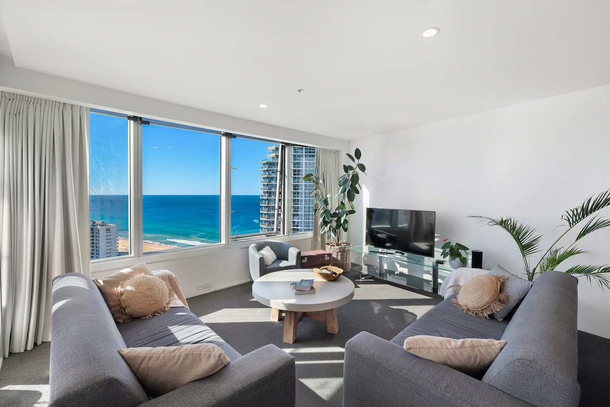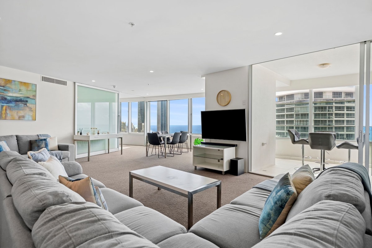 * Stylish & Colourful, Modern, GORGEOUS * Sweeping Views in ‘all’ directions (see photos). Simply STUNNING * Gorgeous NEW Ocean-themed bathrooms * FREE fast WIFI & Netflix & Parking * Beach So close! * Surf Club, Great Dining! * Bicycle coast path, 4 bicycles FREE for you, e-bikes for hire. * Easy access to Trams & Buses, Restaurants & Cafes, Theme Parks, Outdoor Adventure * External pool & spa, tennis court, BBQ area freshly renovated 2025. * Internal gym, sauna, heated pool & spa