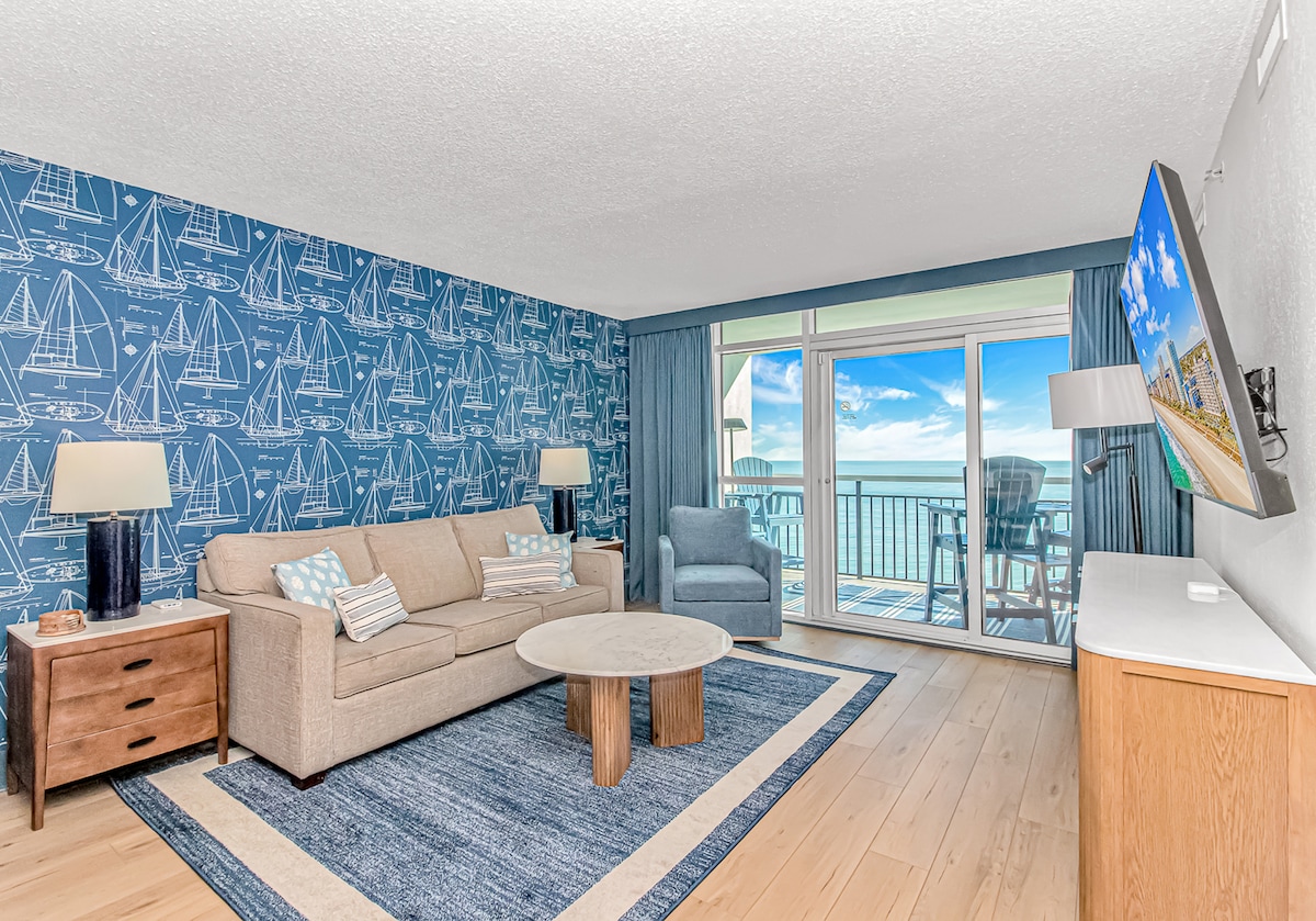 Completely renovated in 2018, oceanfront condo with quartz counter tops, shaker style cabinets & new stainless appliances, new living, dining and bedroom and furniture, flooring, ginormous TV, new drapes, bedding, lighting, paint & more! It's modern, crisp, casual and comfortable! We've provided lots of home conveniences & plenty storage for your own comforts from home. Located in the heart of MB & a short walk to many restaurants, coffee shops, bars, convention center, boardwalk & much more!