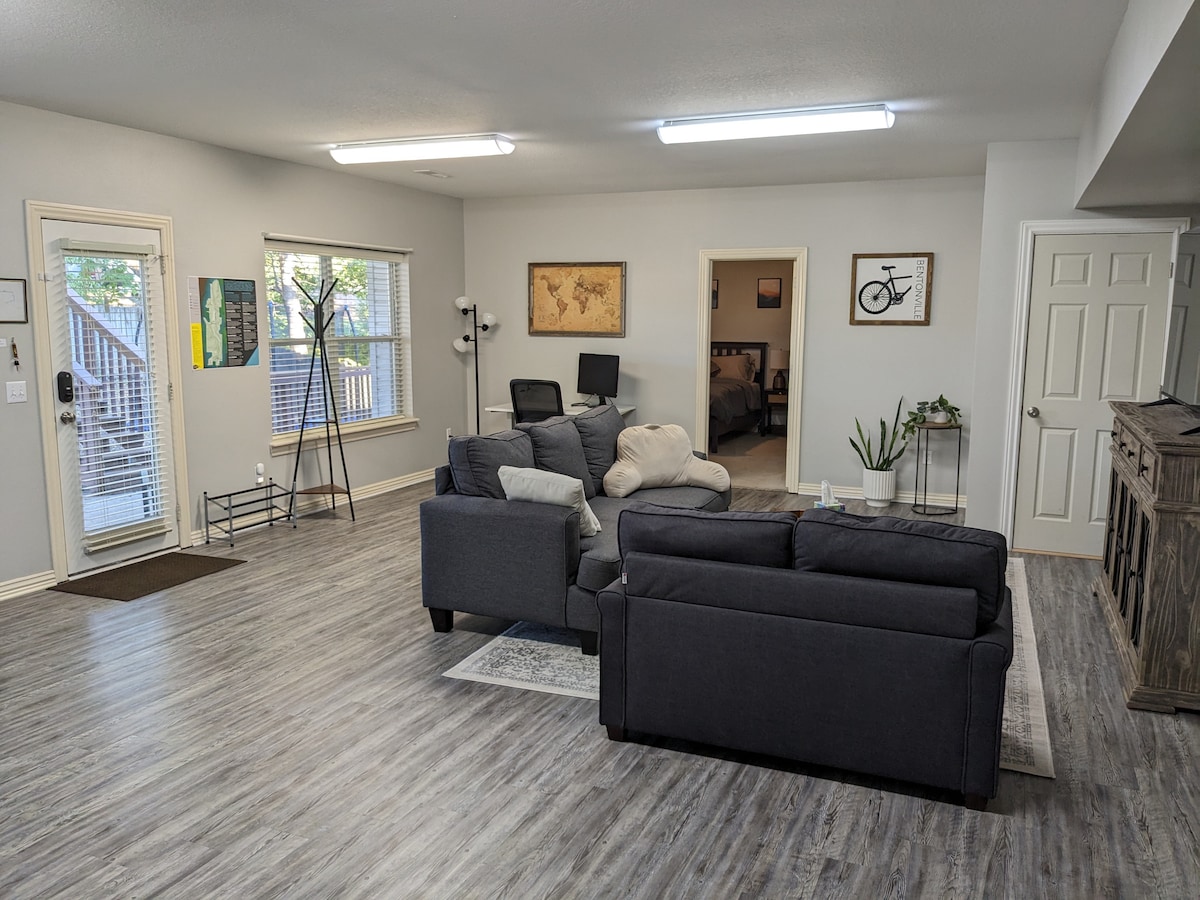 Welcome to our private 1000sqft 2-bedroom apartment in the heart of Downtown Bentonville! - Whole-house water filter and softener system ensures drinkable water from every faucet and shower. - 1st floor unit, 10ft ceiling, 2 king size beds, 1 living room with 75’ TV, 1 full bath and laundry. Covered patio seats. - A full kitchen (no oven) and Jura coffee maker. - 1min walk to bike trail, 5min walk to The Momentary and 3 local coffee shops, ~15min walk to downtown square and restaurants.