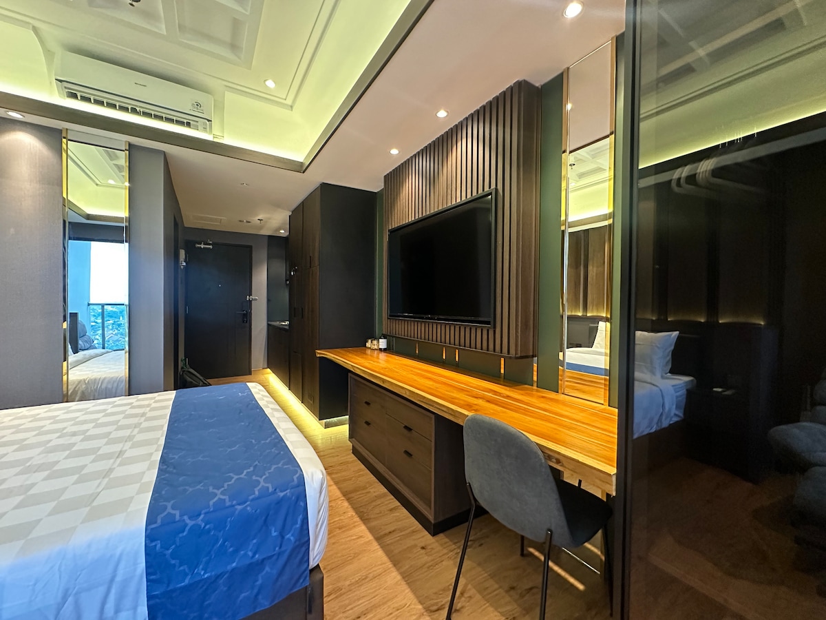 Your home away from home. Uniquely designed and cozy studio apartment for 2 guests + 1 little child. The room equipped with 1 queen size bed, modern bathroom, kitchen with basic cooking equipment, and balcony. Free parking, pool, gym, lobby area with cafe, restaurant, laundry, and mini market. Facilities: - 55 " smart TV - Wifi - AC - hot shower - refrigerator - microwave - electric stove - kettle - kitchen sink - basic cooking equipment - hair dryer - iron Note: - No breakfast