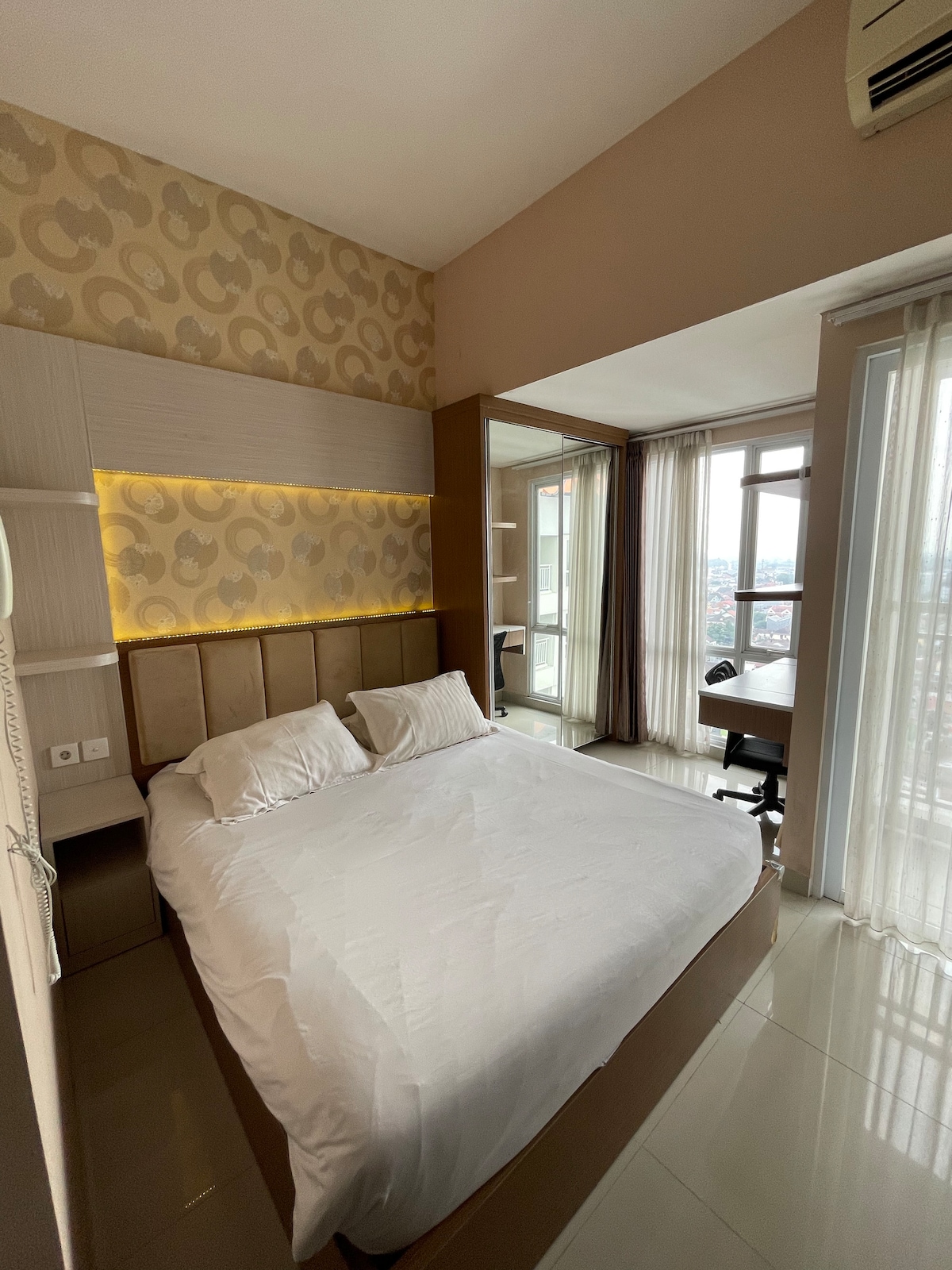 Your home away from home. A cozy studio apartment, uniquely designed in modern style for 2 guests + 1 little child. The room equipped with 1 queen size bed, modern bathroom, kitchen with basic cooking equipment, and balcony. Free parking, pool, gym, lobby area with cafe, restaurant, laundry, and mini market. Facilities: - 55 " smart TV - Wifi - AC - hot shower - refrigerator - microwave - electric stove - kettle - kitchen sink - basic cooking equipment - iron - hair dryer Note: - No breakfast