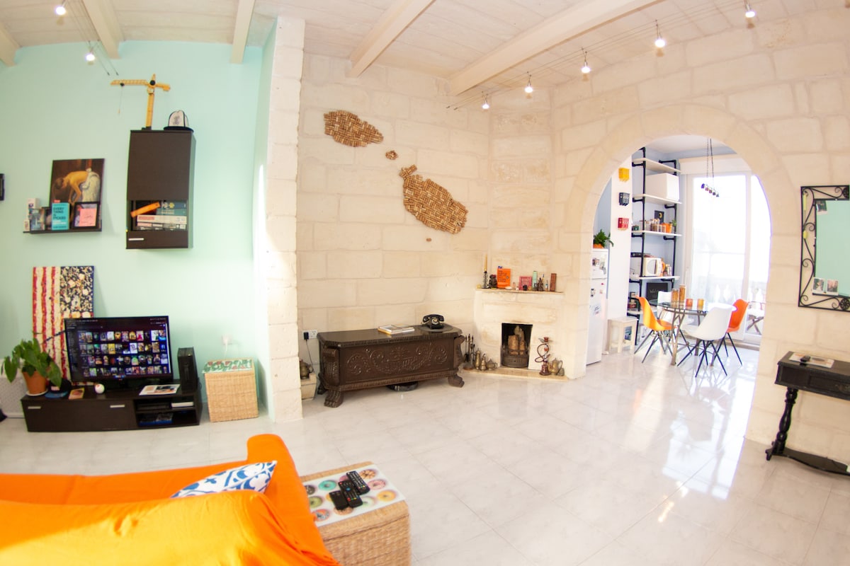 Beautiful Recently Renovated 1-bedroom Traditional Lime Stone Open Space Apartment with Modern Conveniences in Sliema with Valletta View and distant Sea View. Conveniently located on the border of Sliema/St. Julians/Gzira. Short walking distance to many bars, restaurants and beaches. Romantic bedroom with Super King size bed, huge living room with unfold-able Queen-size sofa. Working Fireplace to turn cooler months into cozy months, Rooftop hangout in summer!