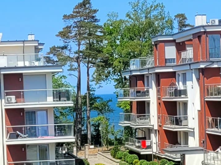 Komfortowy, 2-pokojowy, bogato wyposażony apartament na II piętrze z tarasem, bocznym widokiem na morze oraz miejscem parkingowym w garażu podziemnym. Usytuowany jest bezpośrednio przy zejściu na plażę. Apartament gustowny i przytulny, jasny, czysty. Na wyposażeniu dla naszych gości zawsze świeża pościel, komplet ręczników, kosmetyki, woda mineralna..