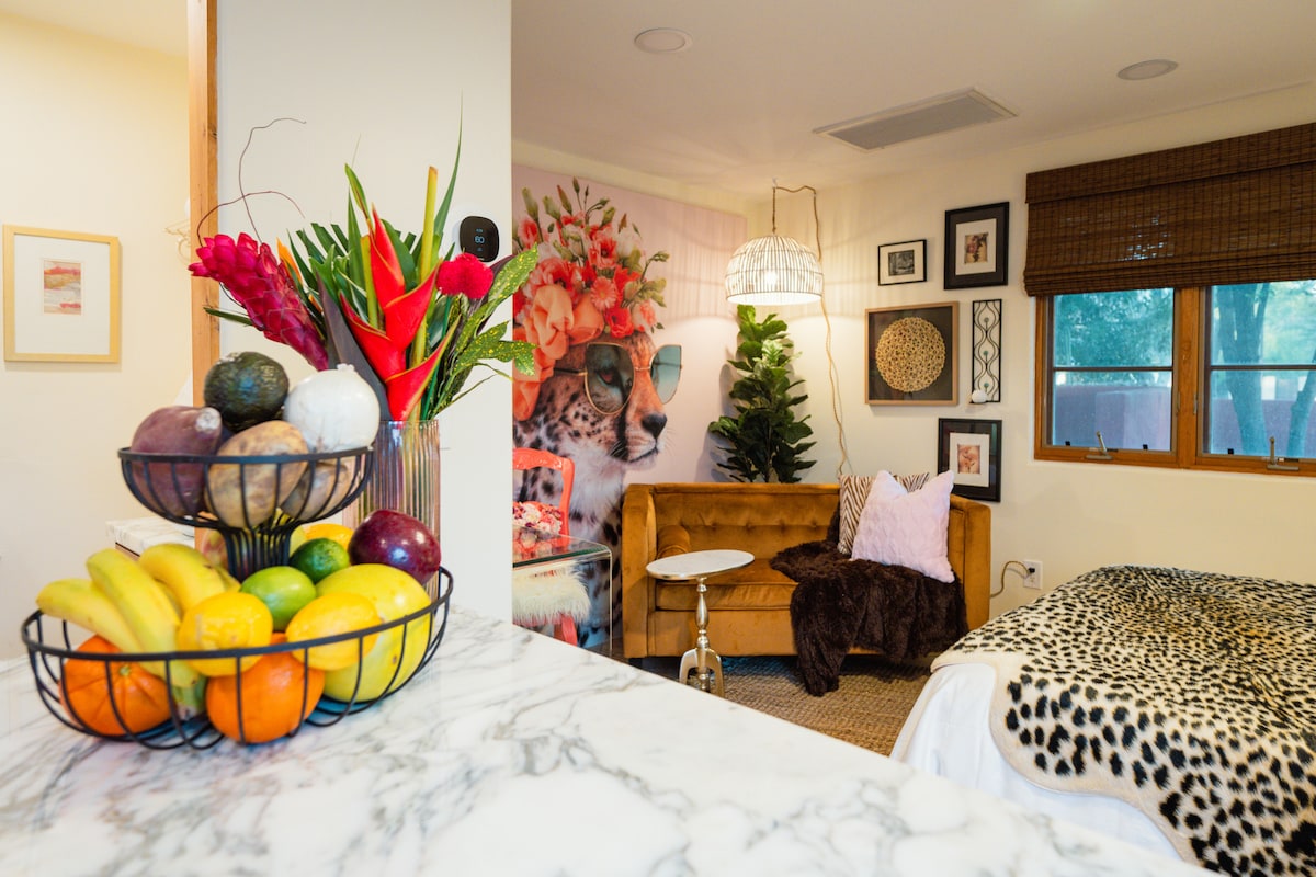 The Space: Welcome to Palm Paradise, your relaxing retreat in the heart of Old Town Scottsdale. renovated in October 2024, this condo blends stylish desert-boho design with all the comforts of home, creating a space that is both beautiful and functional. Unwind on the cozy green corduroy sectional, perfect for napping, or step out onto the private balcony to witness spectacular sunset views over Camelback Mountain. Step into the tranquil bedroom with a king-sized bed and high quality linens.