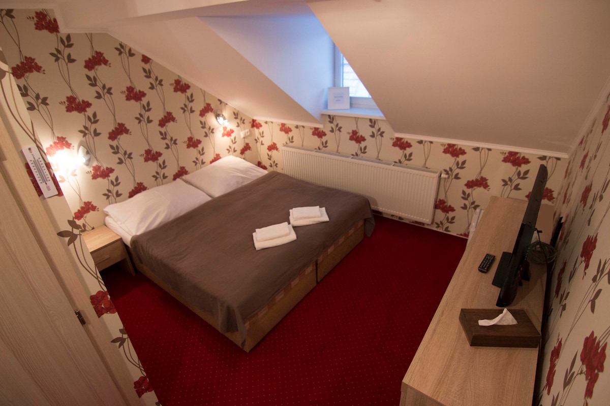 We are a boarding house with a family atmosphere, located right in the centre of historic city Banska Bystrica. In this case, we offer a triple room with one doubled-bed, one single-bed and own bathroom. Also an extra-bed is available on request and for an additional fee. Our goal is to provide quality services at reasonable prices. We always try to work in such a way that we prepare our guests the best possible stay, and they leave us satisfied and happy.